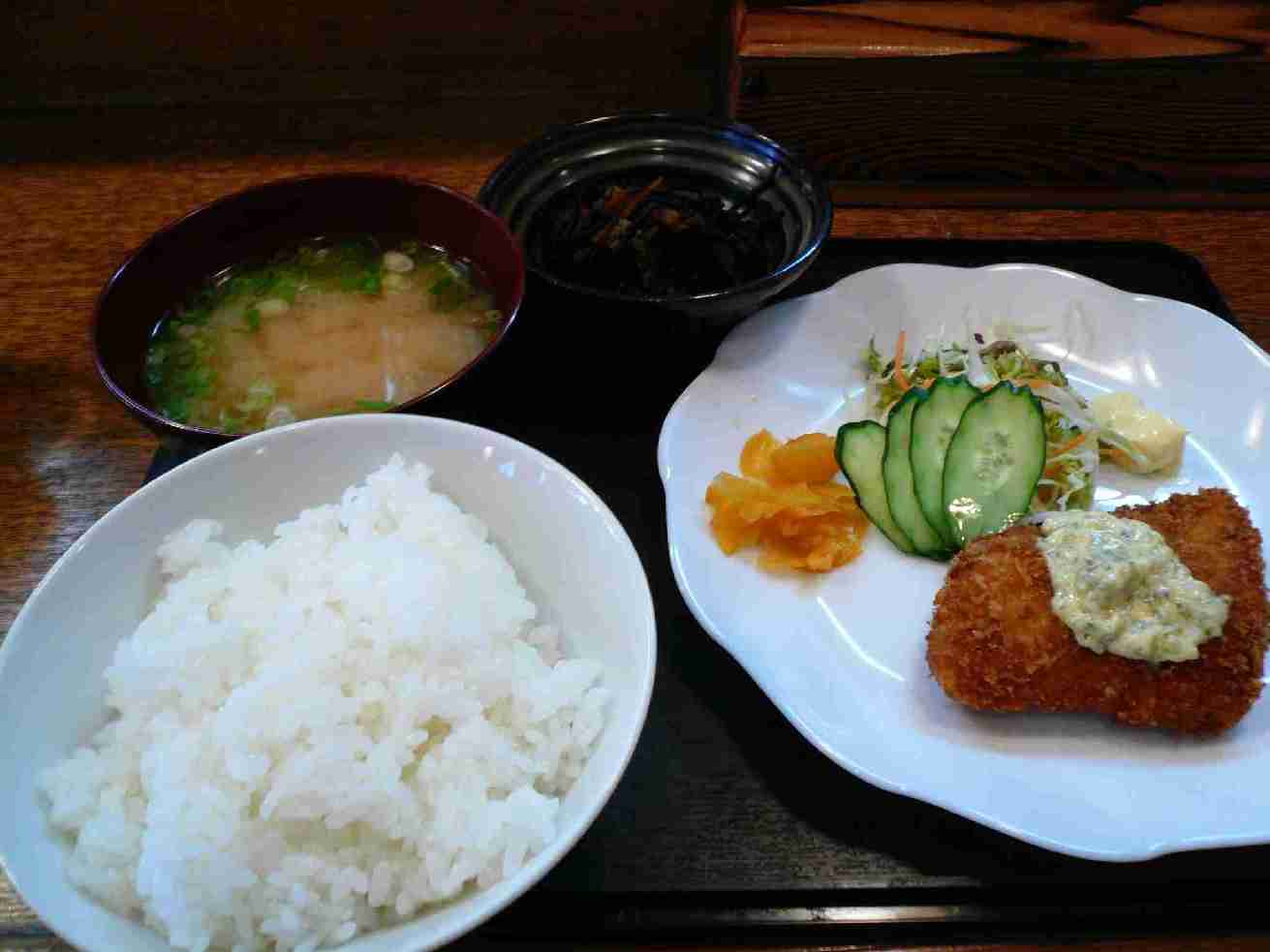 広島市安佐南区祇園3丁目27-11-101 082-871-5448 ひょっこり昼飯をさがすと見つけたひょっこりあった よくわかりにくいお店。 入ると地元の人たちが定食を食べられておられました。 色んな定食があって悩みましたが・・・。 魚フライ定食。600円。 出てきたのはちょっと小さ目の魚フライと、ちょっと少な目のサラダ、普通量のひじき・味噌汁・ご飯。 魚フライがこれだけかぁ・・・、って思ってかじったら、出来立て熱々。凄い脂っこい感じな魚フライだけど熱々だと割と食べれますなぁ。 味噌汁やひじきなんかはかなりお惣菜感覚で、旨い!ってより確実にほっとする味。 このお店はうどんもたくさんあり、次はうどんでゆっくり 食べようかな? ご馳走様でした。