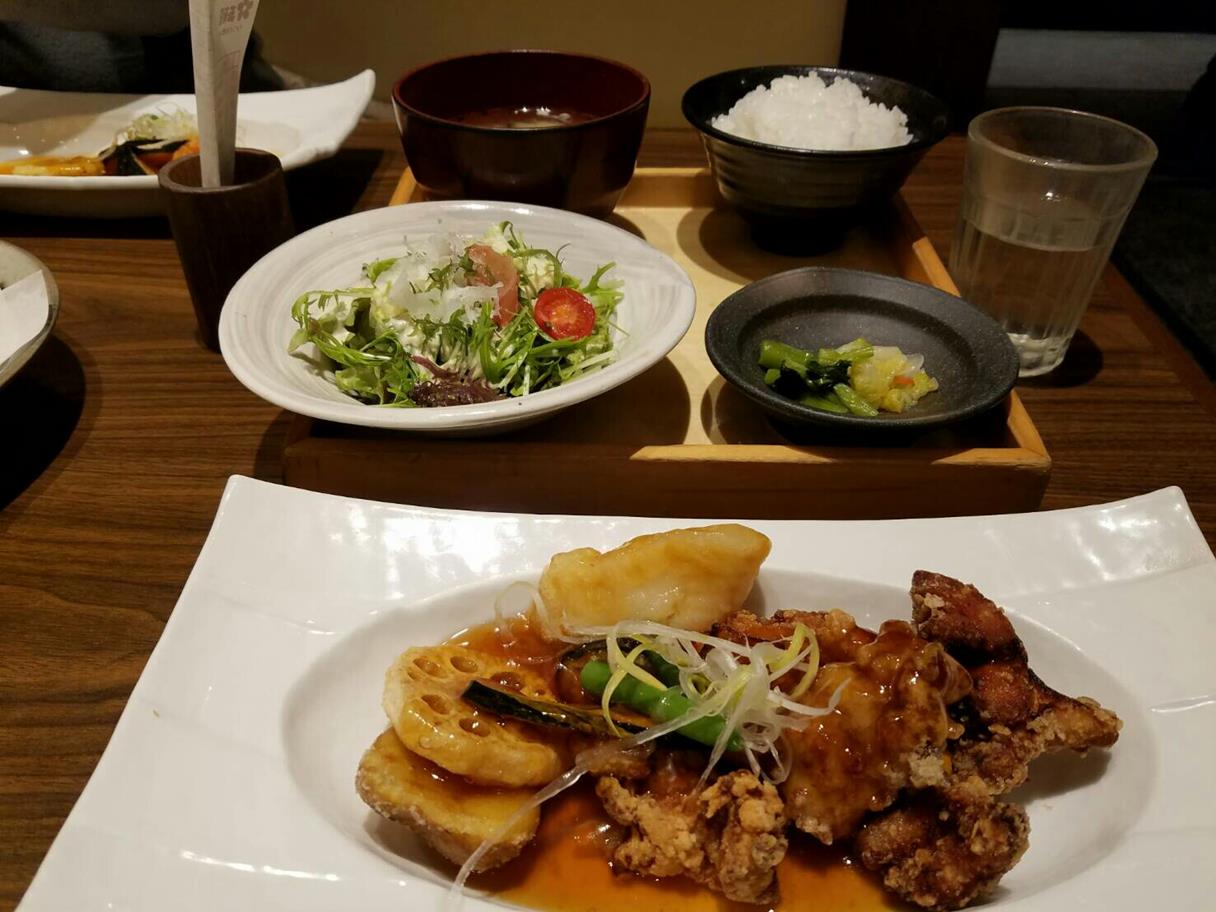 福岡市博多区中呉服町2-9 092-262-5020 今日はこちらのお店でランチを。 和風な造りの小さなお店で気にはなっていたのですが。 なかなか行けておりませんでした。 お店には大分のお酒などが並んでおり、大分料理をメインにしているのでしょうか? ちなみに日替わりのメニューを見てもそんな感じもしました。 スタッフは大将と女性の二人で回されている。 良い雰囲気のお店なので期待値は高くなるね。 日替わり定食800円。 この日はとり天と椎茸の海老詰めとなっている。 とり天はしっとりとした鶏肉に少し厚い衣に包まれていて美味いね。 椎茸は肉厚な椎茸に海老の美味さが負けていない。 メインが素敵で楽しくなる。 味噌汁もしっかりとして美味いな。 小鉢がちょっと弱かったり、ご飯が柔らかかったりと突っ込みどころもあるけど、かなり満足度の高いランチでした。 ここなら夜も面白いかな。 注文する料理を気にしながら食べたらおいしいものが食べれそうだ。 ご馳走様でした!