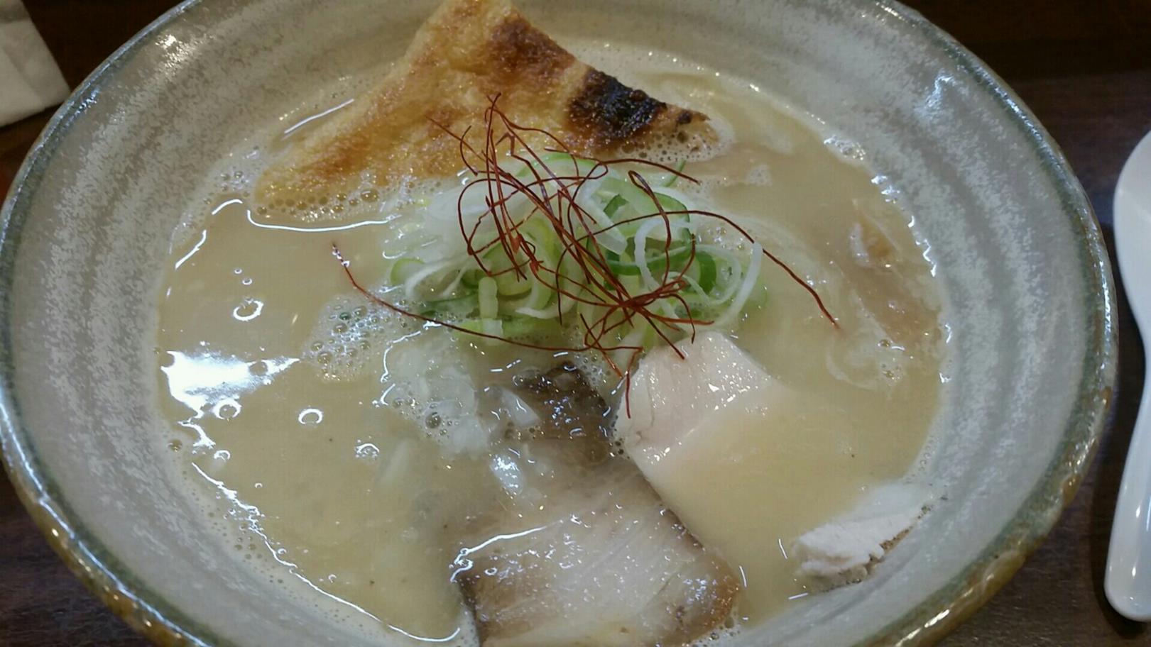 福岡市中央区天神3-5-8 092-980-7288 今日は会社の帰り道に偶然見つけたラーメン屋さんへ。 麺アトリエ? 芸術系のお店? なんて思ったのですが見た目は普通のラーメン屋さんでした。 メニューを見るとはかた地鶏という鶏を使ったラーメンらしい。 せっかくなのでそれをチョイスしようかな。 なんて思ってこちらにしてみました。 鶏白湯ラーメン650円。 綺麗な白湯スープにつるつるした麺。 スープは濃厚そうに見えるのですが、飲んでみたらあれっ? 少し水っぽさというか水臭さが感じる。 どうしたんだろう、麺の水切りが問題だったのかな? 麺もつるつるしすぎててスープに絡まないな。 これはこの時だけのものだろうけど、少し残念。 甘みのある脂のしっかりしたチャーシューも美味しいし、油揚げなんてついていて面白い。 パリッとしているのも良いけど、少し油揚げはスープを吸わせたら美味しいかも。 途中で沈めてみたらよかった。 うーん。 これはまた行かないとな。 時間帯も問題があったのかも。 ご馳走様でした。