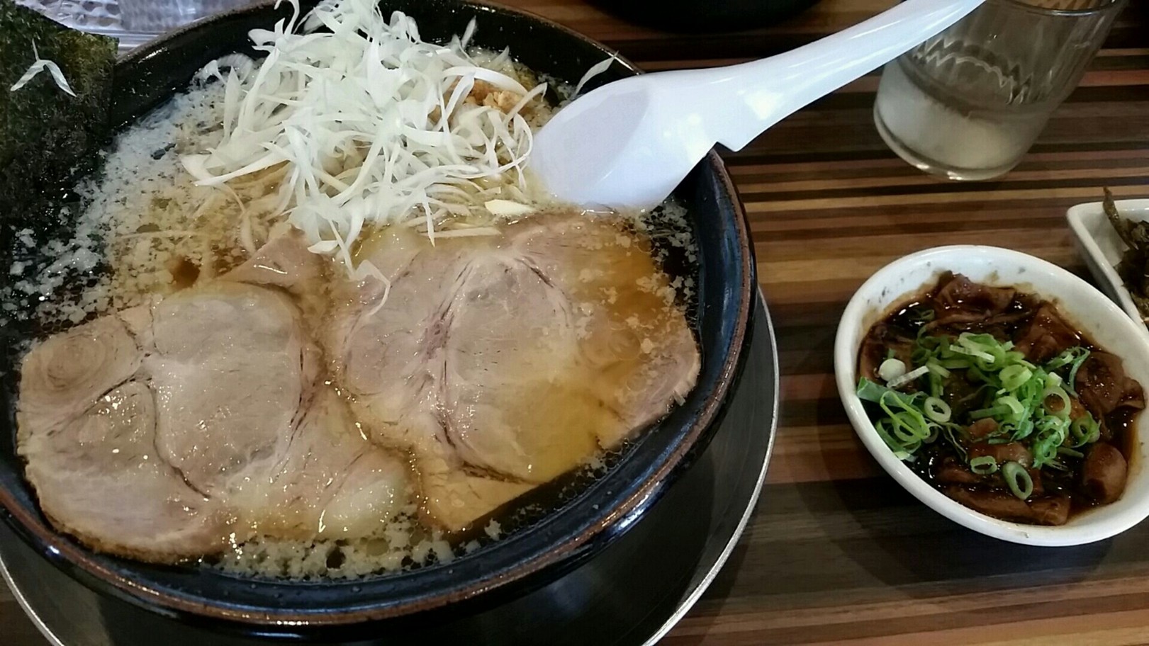 朝倉市甘木202-1 0946-21-2308 今日は仕事で朝倉市へ。 どこでランチをしようかな? なんて思ってうろうろしていて見つけたラーメン屋さんへ。 こちらは駐車場もあり、家族連れからサラリーマンまでたくさんのお客さんがいた。 こういったお店は必ず外さないよね。 券売機でメニューを見るとセット物から単品までいろいろ揃っている。 メインは豚骨系のラーメンみたいだけど、ちょっと疲れていて。 豚骨よりも違うものが無いかな? なんて思って探していると見つけたメニューで。 ついでに面白そうなものもあったので思わずチョイス。 中華そば600円+モツ煮込み200円。 中華そばは脂身が浮いているタイプ。 スープを飲んでみると脂身が気にならずさらっとしたスープ。 あまり主張はしないけど、あっさりというより飲みやすいスープは味わいしっかりかな。 こういったスープは好きだな。 麺は平麺で少し柔らかめにぴらぴらした食感がたまりません。 チャーシューは大きいのが2枚。 これも美味い。 モツ煮込みはこちらでは意外とあるらしいウスターソースで煮込まれたもの。 ウスターソースの独特の風味や味付けが目立ちますが、臭みが出ないのがいいですね。 これは焼酎と食べたいなぁ(笑)。 美味しいラーメンでした。 ここは当たりだなぁ。 次はできるなら豚骨ラーメンも食べてみたいな。 ご馳走様でした! |