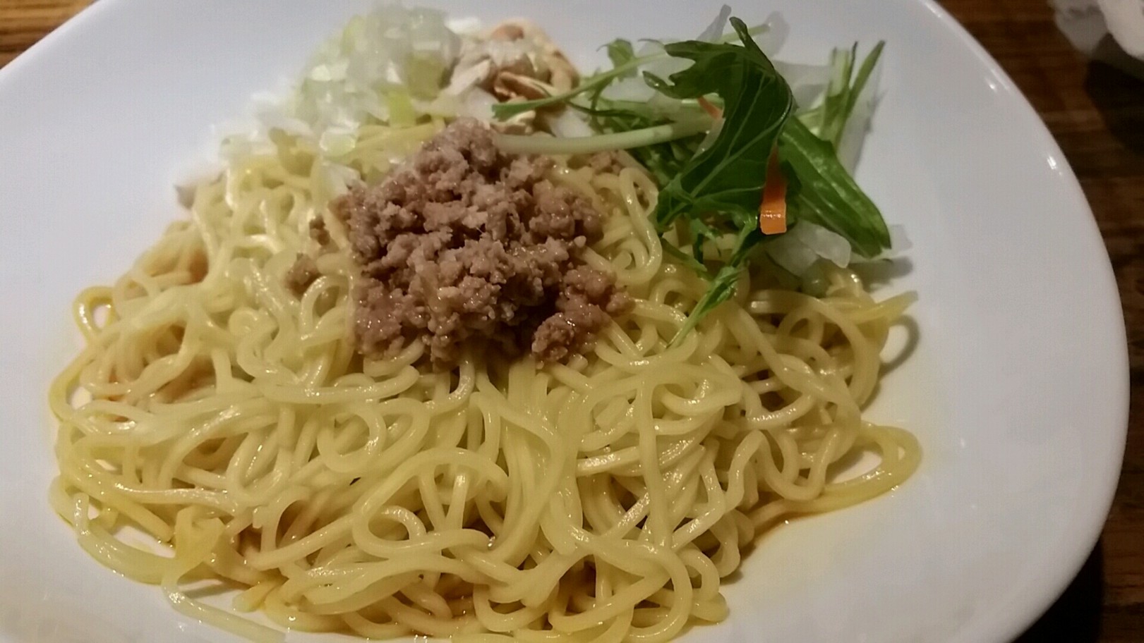 福岡市中央区舞鶴2-7-1 092-713-1055 今日は、夜ご飯でこちらのお店へ。 ふと帰り道に見つけたお店で、どんなお店かな? なんて思ってたのですが、入ると中国料理の炒めたいい香りがして、ここは良いのでは? お店はシックでちょっとしたお洒落な居酒屋さんみたいなお店。 油の香りがこもってないのがいいですね。 夜なのでビールを頂きながら、こちらをチョイス。 水餃子4個250円。 8個500円であるのだけど、4個から頼めるらしいので最小ロットで。 皮がムニムニで柔らかくたまらないね。 具もしっかり練られた肉が旨いね。 2個は酢醤油であっさり食べて。 残りは自家製のラー油をかけて。 ラー油は辛さはあまり無いけど、香りがいいなぁ♪ こういうのに抜かりが無いのが嬉しいですね。 汁無し担々麺780円。 ご飯もの、麺類は夜は全てこの値段みたいですね。 見た目は辛くなさそうだし、ゴマのような醤が強く色付いているので。 甘いタイプの汁無し担々麺はなのかな? なんて思って食べるとビックリ。 タレは醤がメインなんですが、あまり重くないのですよね。 ゴマっぽくなく、もしかしてピーナッツの醤なのかな? 甘めもあまりなく、濃厚すぎずに食べやすいですね。