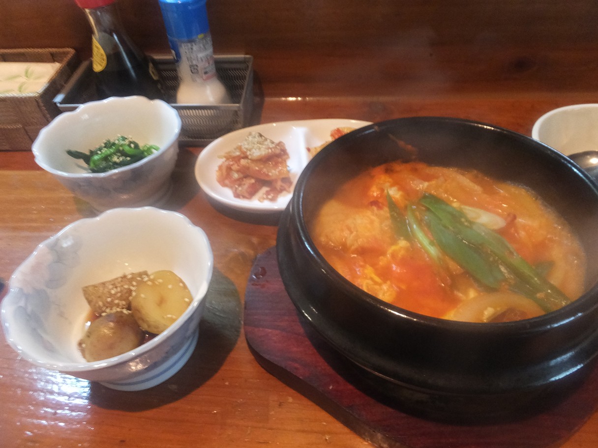 福岡市博多区下川端町1-331 今日のランチは博多座の近くにある小さな勧告料理屋さんへ。 スナックみたいな感じだけど、ランチではしっかり韓国料理を出してくれるようだ。 お店はママさんのような方が一人でやられていた。 メニューを見るといろんな韓国料理があって迷うけど。 この日は寒かったのも合ってこちらをチョイス。 スン豆腐鍋定食700円。 豆腐チゲかな、それとジャガイモの小鉢、ほうれん草の胡麻和え、キムチとご飯という組み合わせ。 豆腐チゲは柔らかい豆腐に野菜がたっぷり。 あさりは3粒ほど入っていた。 辛味も軽く、あっさりした味わいで熱々の豆腐が美味いですね。 最後はまたご飯をかけてキムチクッパにして。 こういった食べ方が出来るのが好きですねぇ。 キムチは発効がしっかりされていて酸味が強いタイプ。 ジャガイモがほこほこして甘い味付けだったのがびっくりしたなぁ。 美味しいランチでした。 こういった穴場もいいですね。 次はビビンバ系も食べてみたいな。 ご馳走様でした。 |