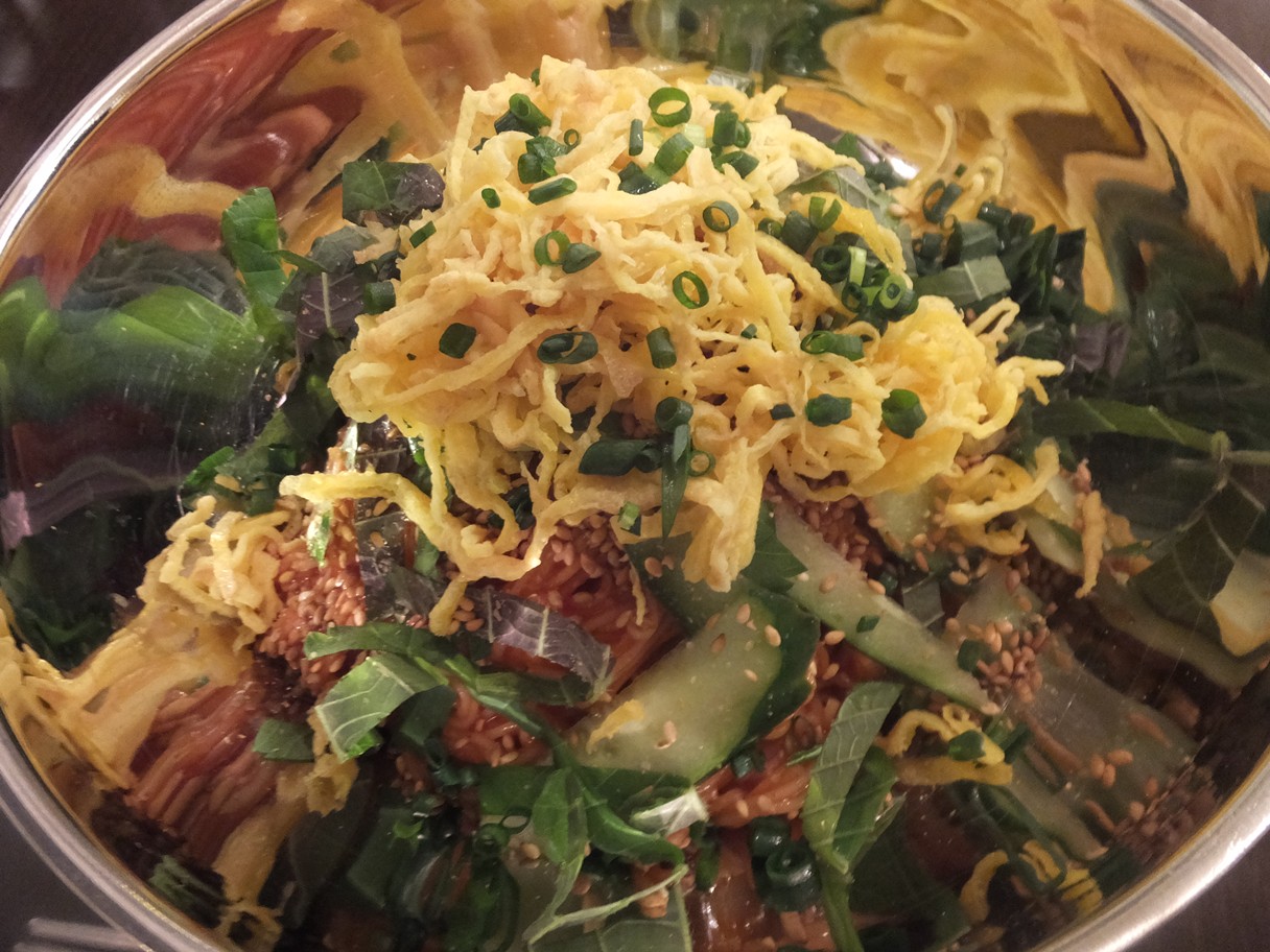 福岡市博多区対馬小路11-18 092-262-4140 今日は去年の末くらいに出来た韓国料理屋さんへ 現状夜だけの営業なのでなかなかいけなかったのですが、最近の仕事の忙しさで夜ご飯を少し食べたくなったので訪問してみました。 店には韓国のスターたちの写真が一杯貼ってあったり。 韓国アイドルのDVDががんがん流れていたりと韓国一色。 こんなところに一人で行っていいのかしら? なんて思いながら気にせず料理をチョイス。 どんな料理だろう・・・。 ビビングクス800円。 麵料理と書いてあったけどよく知らないメニュー。 辛そうなジャンで和えられた素麺の上に大葉ときゅうりがたっぷり。 その上に錦糸卵が乗っているシンプルな出来。 麵や具を底にたまったジャンとともに和えて見ると少しから目だけど、甘みも感じるタレが美味しいですね。 ちょっと味噌っぽい風味も感じるジャンはこの料理に良くあってると思う。 そうめんをこういった食べ方をさせるのはさすがだなぁ。 具材は大葉の香りがこの料理を引き締めてくれてよくなるね。 面白い料理でした。 なかなか経験できない料理が食べれてよかったです。 次はシンプルにビビンバかな? ご馳走様でした。