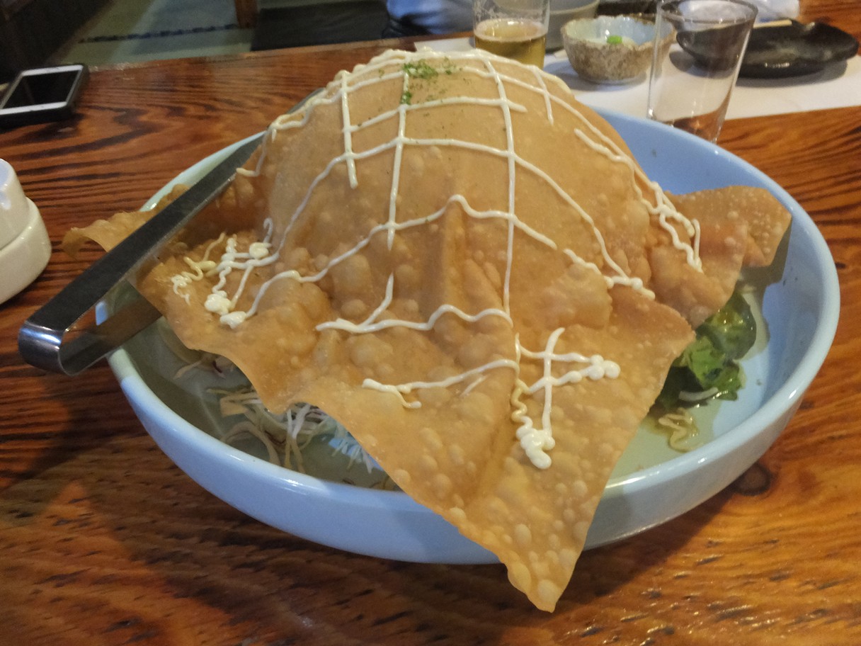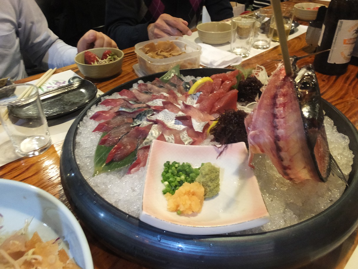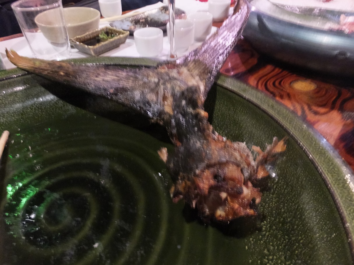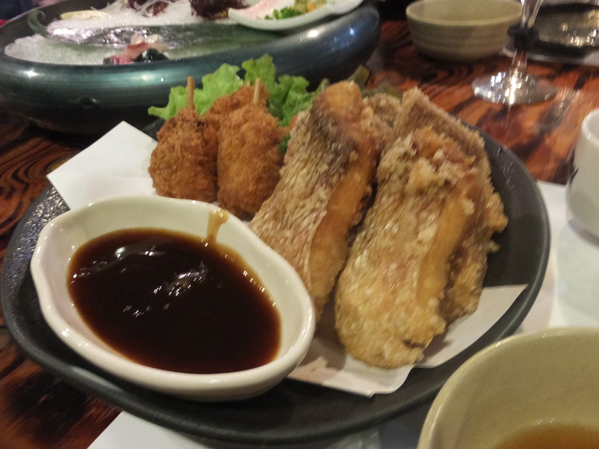 福岡市中央区長浜1-4-15 092-716-9988 こちらのお酒のイベントは2か月ぶりですね。 ありがたいことに美味しいお酒をたくさん呑める機会を作ってもらえます。 それとともに、美味しい料理もいただきます。 たぶんこちらのお店でもちょっとイレギュラーなメニューを出してくれているんでしょうね。 こちらは綺麗な料理と言うよりお酒に合うしっかりした味付けが特徴かな。 さて今回もどんなんが出たかと言うと。 つきだしは枝豆豆腐かな? さらりと豆腐が食べれて嬉しいね。 そして、今回参加してもらった人から頂いたメンマとイチゴ。 メンマは辛味は強くなく少し濃いめの味付け。 ラーメン用と言うよりおつまみ用ですね。 これがなかなか美味かったです。 イチゴは立派な大きさ。 とてもいい香りでお酒の香りを味わう前に幸せタイム。 これはいですねぇ♪ サラダ。 大きなワンタンを上にかぶせたサラダ。 中身は半熟卵を絡めたチーズの入っていないシーサーサラダみたいな感じ。 皮のカリカリ感がたまりませんね。 刺身はいい角度で撮れず。 でも鯵の立派な刺身に赤身の刺身。 甘めの醤油とよく合いますね。 薬味をたくさん使わないで食べてしまいました。 鯵の骨は、後でから揚げにでもしてもらったよかった←してたらごめんなさい。 今回のメインイベントはこちら。 鮪の頭がドンと来ました! 立派な鮪の頭でみんなびっくり。 しっかり焼かれた頭をごそごそとほじくりながら食べると濃縮されているような味わいで美味いですねぇ。 これで酒が呑めたらそら幸せですよ♪ ちなみに写真が荒いですが、しっぽの部分も頂きました。 こちらもまた美味いですね。 ぎゅっとした味わいがあって。 でもやっぱり大きいなぁ、マグロって(笑)。 豚シャブ。 座っている所によっては豚を全部放り込む人もいたけど(苦笑)。 うちの席は丁寧に一人ずつしゃぶしゃぶと。 柔らかく臭みもない豚でこれは美味いですね。 こちらも充分メインになりますな。 フライ。 このタイミングで揚げものは結構きつい(笑)。 串カツはちょっと油が強く、魚フライは実はパスさせてもらった。 ちょっと何となくなんだけど。 重そうで(苦笑)。 〆でしょうか? 茶碗蒸しが出てきた。 海苔の香りの餡がかかっていてこれは美味いですね。 柔らかい卵によく合っていました。 もしかしたらデザートが出たのかな? それも食べてないからわからないけど、相変わらず素晴らしい料理たちでした。 また次のイベントも楽しみだなぁ。 ご馳走様でした!