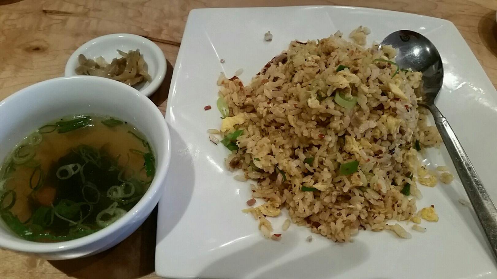 福岡市西区野方1-22-20 092-812-8011 こちらは11月に出来たお店かな。 急にできたお店で、何ができるとか予想もしないうちに出来ていた。 入るとどうやら居抜きっぽい感じでちゃんぽんやラーメンのやるような雰囲気のお店ではなかったなあ。 ご主人さんとそのお母さんのような方がお店を回されていた。 メニューはちゃんぽんがメインでほかに少しあるくらいかな。 さて今回はお勧めのこちらのメニューをチョイス。 ホルモンちゃんぽん900円。 ここのお店の特徴として生玉ねぎが乗っていること。 どのメニューにも生玉ねぎが乗ってくるのがポイントかな。 こちらのメニューの特徴はもつ鍋の〆のようなイメージなんだろうね。 濃厚に感じるスープは脂が強く感じる。 こってりしている割には味付けをジャンクに持って行ってるんでなんだか口が進む。 でも最後の玉ねぎですっきりと仕上げてるのかな。 ちゃんぽん麺の柔らかさもなんだかほっとするし、いいですねぇ。 そういえば魚粉が別盛であると聞いていたがなかったなぁ。 まぁこれにはさらに味を濃くする必要性はないけどね。 次はかしわちゃんぽんを食べてみようかな。 ご馳走様でした! スパイシーチャーハン♪ 福岡市西区石丸1-12-25 092-836-6855 今日は遅い時間のランチ。 ってことで遅くまでランチタイムをやっているこちらのお店へ。 遅い時間でも割とお客さんがいるもんですね。 って思ったらお持ち帰りの待っているお客さんが多かった。 そうか、夜は持ち帰り専門だもんね。 今回は麺を避けてこちらをチョイスしてみました。 ドラゴンチャーハン780円。こちらのチャーハンは本当にパラパラだね。 辛味の効いたチャーハンは唐辛子の辛さと。 山椒のむせるような辛さがたまりませんね。 香りもとても高いチャーハンは美味いね。 でもやっぱりこちらは麺が好きかな。 こちらも美味いんだけど、ちょっと値段は高く感じちゃったしね。 次はノーマルも頼まないとなぁ。 ご馳走様でした!