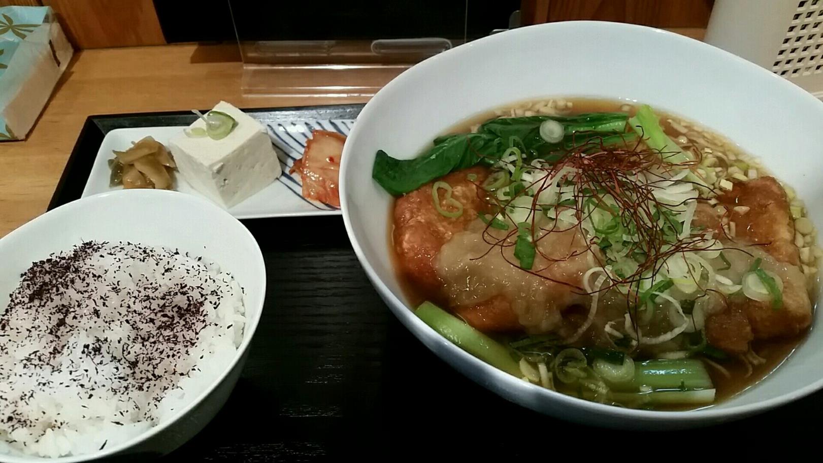福岡市博多区古門戸町5-5 今日は久々にこちらのお店へ。 ちょっとツイッターとかでこちらのお店にパーコー麺が出来たということを聞いて、やってきました。 メニューはちょっと増えましたね。 とろみを効かせたメニューというくくりの中、色々と工夫されているなぁ。 なんて思いながら見ていました。 今回は噂通りのこちらをチョイス。 パーコー麺ランチ850円。 ちょっとイメージは違うものが来た。 骨付きのチキンが揚がっているのではなく、大きな胸肉の鶏を揚げていた。 しかも結構厚い衣で面白い。 パーコー麺はカリッとした歯ごたえが期待していたのですがずっしりとしていて面白い。 衣が強く、スープに浸っても弱くならないのが面白いね。 ボリューム満点のチキンはお腹にもずっしり感じる。 とろみが上に乗っていてこれは・・・。 よく効果がわからないけど、混ぜると少しずつとろみが出てくる。 確かに餡がつくと旨く感じるよね。 しかしこれにご飯とおかずがつくと。 腹一杯になり過ぎるね(笑)。 夜になっても全く腹が減りませんでした(笑)。 次は汁無し麺も食べてみたいな。 ご馳走様でした!