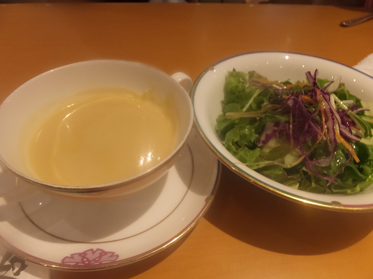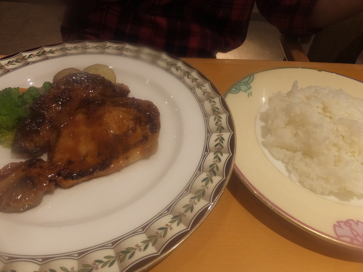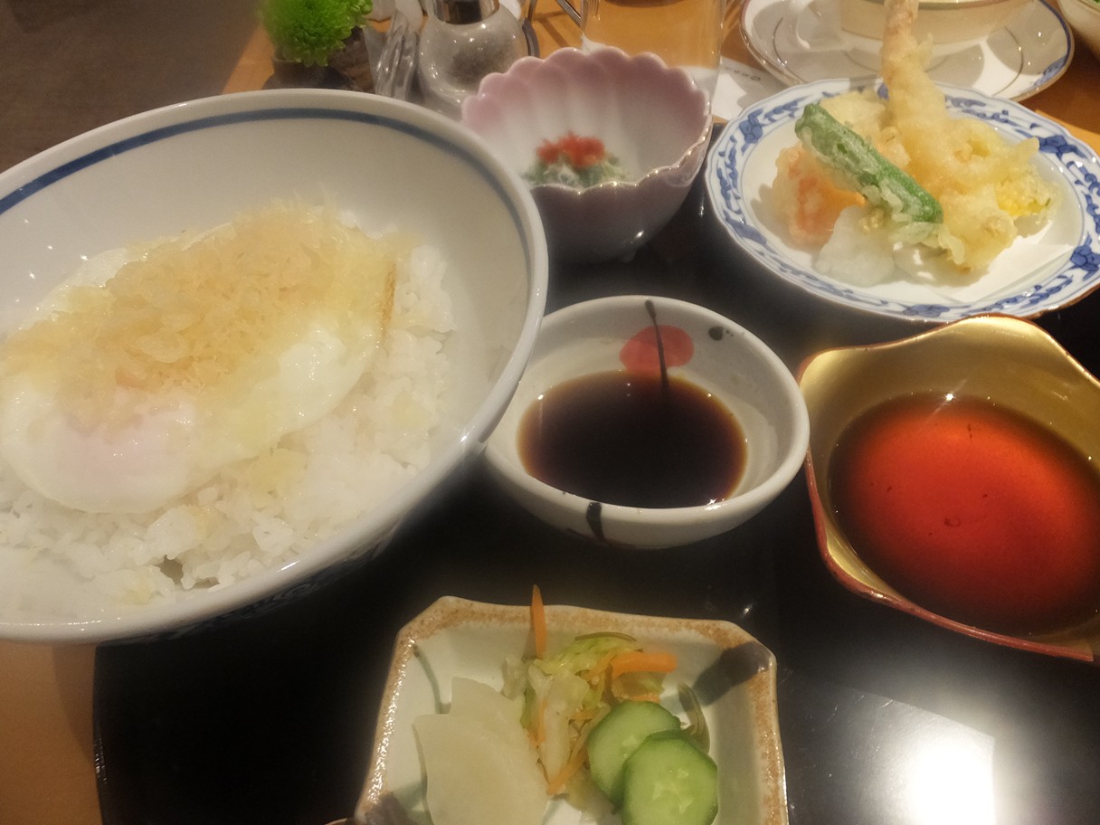 熊本県熊本市中央区城東町4‐2 熊本ホテルキャッスル内 096-326-3376 今日は熊本のキャッスルホテルの中にあるお店へ。 ホテルでランチなんてなんて素敵な事でしょう(笑)。 熊本城へ観光に行き、義母さんが来られて。 子供もいると言うことで安心して食べれるところを考えるとここがいいかな? なんて思って入店。 こちらは洋食と和食の混合したレストランと言う感じのお店。 料理は色々ありますが、とりあえずホテルと言うことでサービス料が10%かかります。 そこは安心して食べれる事を考えると仕方ないですよね。 さて、我々はこちらをチョイスしました。 シェフランチ1,300円。 まずはスープとサラダから。 スープは丁寧に漉されていたコーンスープ。 口当たりが気持ちいいスープでなかなか美味いですね。 サラダは酸味の効いたドレッシングが特徴かな。 美味しいですね。 メインはライスと(パンでもOK)とポークソテー。 脂身もしっかりついているポークソテーは意外と和風ですね。 照り焼き風のタレで焼かれた肉はご飯に合いますね。 でもジャンクすぎないところはさすがと言うべきかな。 タレでご飯を食べると結構進んでしまいますねぇ。 とろ~り玉子の玉天丼1,400円。 卵を揚げた天丼ご飯に天麩羅、小鉢に吸い物が後で来た。 油を強化した卵は美味いねぇ。 ちょっと油っぽさは感じますがこれに醤油をかけて食べると贅沢な卵かけご飯になる。 天麩羅を乗せると天丼にもなるし、色々と楽しめるのがいいですね。 天麩羅はちょっとクリスピーかな。 カリカリしていていい食感でした。 面白い定食が食べれました。 次はパスタ系も食べてみようかな。 良いレストランでした。 ご馳走様でした!