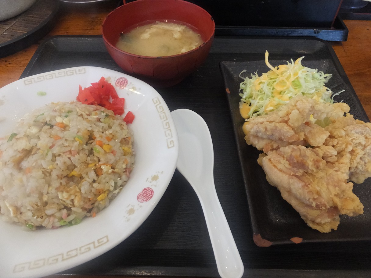 福岡市博多区大博町13-4 092-291-9322 この日も忙しくあたふたとランチを。 と言っても15時過ぎ。 この時間にあいているお店と言えば・・・、って思ってやってきました。 相変わらず休憩なくやっていただいていてありがたく思ってます。 今回はカレーでも、なんて思ったのですが。 よく見たら面白いメニューがあったのでこちらをチョイスしてみました。 炒飯唐揚げセット600円。 漫画の「グラゼニ」でよく出ていたメニューですね。 ちょっと漫画と違うけど(笑)。 炒飯と大きな唐揚げが3つ乗ったなかなかボリュームのある定食だ。 炒飯は若干しっとり系かな。 思ったほど油っぽくないのがいいところですね。 なんだかわしわしと食べてしまうジャンクな炒飯でいいですね。 唐揚げは衣と皮の部分がしっかり揚がっていて、ガリガリ表面と中の柔らかさが楽しいですね。 熱々なのもありがたいし、これにしっかり味噌汁も付いているのでお腹も満足。 ありがたい定食屋さんだ。 次はまたカレーを攻めようかな。 500円で食べれるありがたみもあるし。 ご馳走様でした!