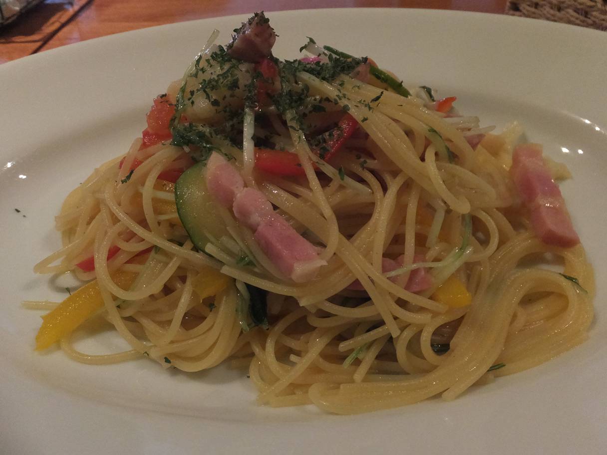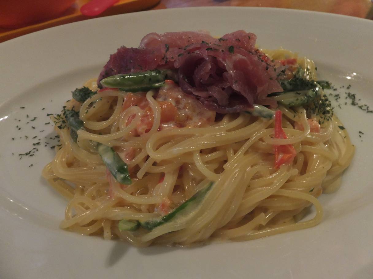 広島市西区大芝2-6-15 082-237-7778 今日は相方の友達家族達と食事会をしに。 相方にとってはこの会がメインで。 非常に楽しみにしていた。 場所は久々のこちら。 こちらは昔行ったのですが、子供様に遊ぶスペースがあり。 更に保育士の女性がいるので安心できる。 こういったお店はありがたいですね。 さて大人達はこういった物を食べましたとさ。 パスタランチ1,480円。 まずはサラダとパン、スープがつく。 パンはガーリックトーストかフランスパンのどちらかと言うことで僕はフランスパンで。 サラダは酸味の効いたドレッシングが旨いし、野菜自身も旨いね。 スープはクリーム系の特別感のない物かな。 でもこういった物がちゃんと付くと嬉しくなる。 僕は野菜とベーコンのガーリックパスタ。 とてもボリュームがあるパスタでニンニクのびしっと効いたなかなか旨いパスタ。 ニンニクが全体に強く効かせてちょっとジャンクに感じる部分と、野菜の甘さが良いですね。 僕はこのパスタ、気に入ってしっかり食べました。 値段も少し高いかな、なんて思ったけど結構満足。 相方は生ハムとサーモンのクリームパスタ。 一口だけ頂いたけど、塩分の効いたサーモンと生ハムの塩分が結構強く感じるね。 でもちょっと太めのパスタによくあって旨いと思った。 場所のありがたさも含めてありがたい時間でした。 子供がいたらこのお店はありがたいですね。 また利用したいな。 ご馳走様でした!