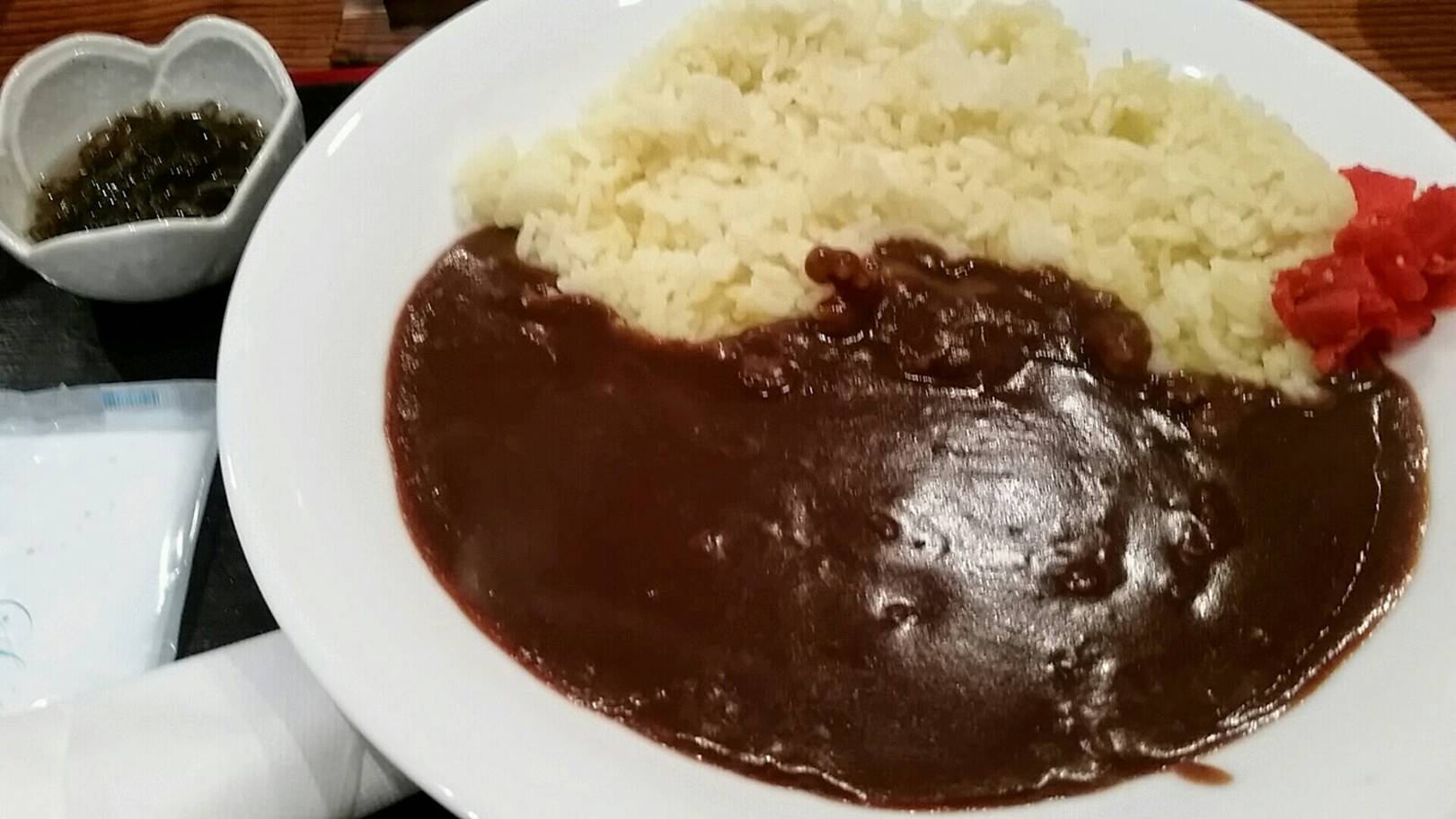 福岡市博多区冷泉町8-17 092-263-7560 今日は新年会前のランチで立ち寄ったお店。 呑みも続くので身体を労るならカレーかな。 なんて思っていたらメニューに魅力的なものがあり訪問。 お店は喫茶店ですが、沖縄のメニューが色々あった。 しかしランチはカレーがメイン。 さてその中でもベーシックなこちらをチョイス。 ウコンカレー500円。 ウコンカレーにラッキョウか沖縄もずくが付くと言うことでもずくをチョイス。 しかしよく考えたらラッキョウって島ラッキョウだったかも、って思うと少し悔しい(苦笑)。 どろっとしたカラーにパサッとした古米が付く。 カレーはウコンをたっぷり使っていると言うことだけど、まずは少し苦みがある。 その後、辛味が追いかけてくる感じかな。 特別辛さは強くはなかったけど、安心感のあるかれーですね。 強いとろみでご飯を食べさせてくれます。 具は溶けているのかな? かなり小さくなった肉が数個は行っていたけど美味しいものでした。 モズク酢で少し口を爽やかにして終了。 肝臓に喜ぶカレーでした(笑)。 このカレーをベースに具のトッピングがあるようなので次はそこですね。 ご馳走様でした。
