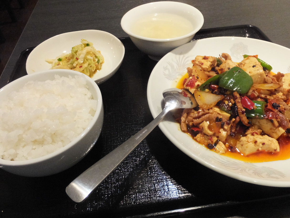 福岡市博多区下呉服町4-13-103 092-282-3386 今日は、こちらのお店に行ってみると・・・、あれっ? また店が変わっていた。 ここも1年毎に店舗が変わっている気がする。 こちらは北中国料理を看板にしていた。 でもランチは酢豚やチンジャオロースがあってもう一つピンと来なかった。 その中でちょっとっぽい料理を頼んでみた。 麻婆豆腐定食680円。 ラー油がたっぷり使われた麻婆豆腐はなかなか辛そうだ。 でも食べてみると唐辛子辛さはあまりなく、それよりも山椒の辛さが強い。 黒いつぶつぶは全部山椒。 ガリガリして噛むと山椒の辛みと香りが追いかけてくる。 面白い麻婆豆腐ですね。 豆腐はしっかり硬め、ちょっとおかずっぽくて面白いな。 スープはちょっとぬるいタイプ、ご飯とスープのおかわりはOKってのが本当に嬉しい。 ちょっと荒いところもあるけど面白いお店だな。 あとタバコが凄かったのは辛かった。 まぁ個人点でタバコOKだと仕方ないかな。 ご馳走様でした。