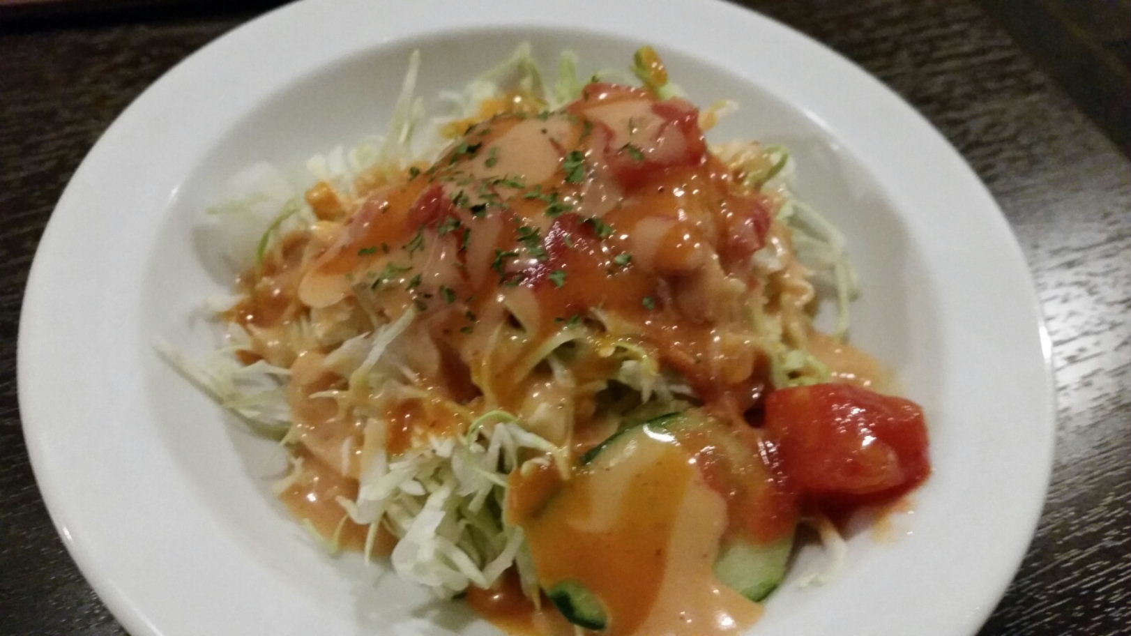 福岡市博多区石城町3-22 092-291-5234 さて、今日のランチは久々にこちらのお店へ。 無性にカレーが食べたくなって、こちらのお店へすたすたと。 近くでは只今11月場所が行われているからか、道には力士がたくさん居る。 ほんとにごっつい身体をしているものだ、なんて思いながら訪問。 こちらは500円で少し量の少ないランチもやっているのだけど。 せっかくここに来たらやっぱりガッつりとランチを食べたいよね。 ってことで今回もまずは。 サラダから。 全てのランチに付いてくるようだ。 濃厚すぎるくらいのドレッシングにトマトの刻んだ物がアクセントになって良いですね。 でもカレーを食べるのでもう少しあっさり目の方が僕は好みだけど。 でも野菜が最初に食べれるのはとにかく嬉しいよね! 日替わりカレー850円。 増税後も据え置き価格となっていた。 相変わらずの2種類のカレーに大振りの唐揚げが4個と目玉焼き。 ガッツリランチだね。 今回はキーマカレーが終わってしまっていて北インドカレー(左)とスリランカカレー(右)というチョイスとなった。 まずは北インドカレーを食べてみると、思った以上に甘い食感がまずくる。 野菜の甘みかな? なんて思っていたら後から辛みも攻めてくる。 とろみのあるカレーで少し重さも感じるけど、これはこれで旨いな。 でも僕はスリランカカレーが好きになりました。 食べた瞬間は甘みを感じる程のフルーティさ。 でもしっかりスパイスが効いていて、後から辛みも追いかける。 油も使って香りを出してくれているのかな? 面白いカレーで後半は汗もかきながら完食。 唐揚げは今回カリッとした衣でカレーに絡めて食べても美味しかった。 目玉焼きはありがたいね。 美味しいランチとなりました。 次は、500円ランチも食べてみようかな? かなりお得そうだしね。 ご馳走様でした!