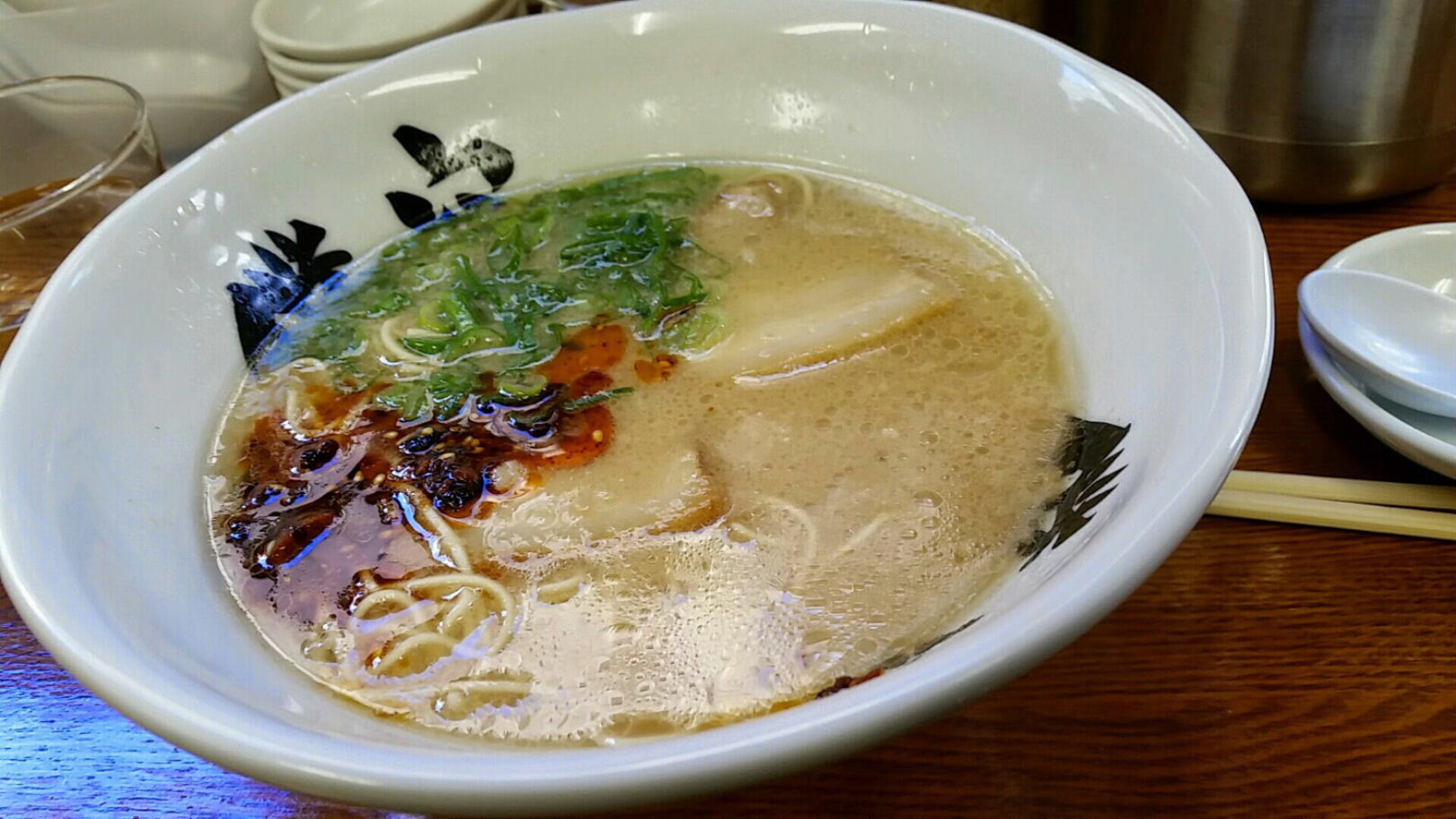 福岡市博多区神屋町3-24 今日は新店訪問へ。 ってより12月3日OPENのラーメン屋さんですが。 こちらは前に「テール屋」さんがあった場所。 そうですか、期待してたんだけどなぁ、「テール屋」さん(涙)。 さてこちらはどこかに本店があるようで、2号店でしょうか? こちらは色んなメニューがあるのですが、この日はプレオープンとしてラーメンと替え玉、ご飯のみ。 ラーメンも色んな種類があるのですが、この日はこの1種類でした。 豚骨ラーメン500円→この日は250円。 豚骨ラーメンはしっかり乳化されているけど、表面にも脂がしっかり浮いている。 そのおかげかずっと熱いまま食べれるね。 シンプルな豚骨に見ての通りラー油が浮いている。 具が沢山入っているラー油は美味しいですね。 ただ、正直重くなっているのも事実。 この辺り、上手にバランスを作ればいいなぁ。 チャーシューは柔らかく脂もしっかり。 麺はしっかり硬めに茹でられていた。 これからどうなるかなぁ。 次はメニューにあったカレー系のラーメンを食べてみたいな。 期待してますよ! ご馳走様でした。