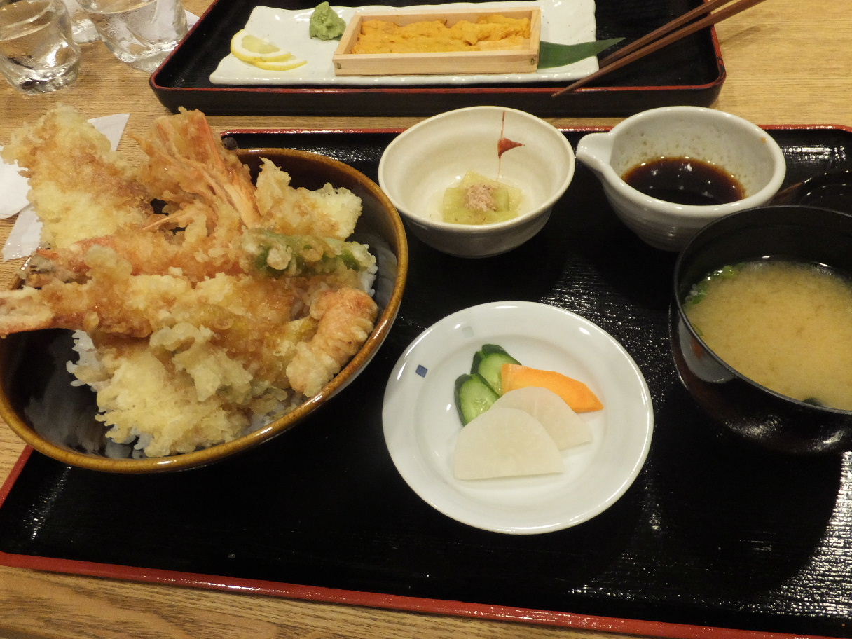 福岡市博多区美野島1-4-32 092-432-7302 こちらのお店に再訪問しました。 ちょっと時間を空けましたが、家族でもこちらは気に入っていたのでまた行きたいね。 なんて話になっていました。 ちょっと家から遠いのでそちら方面に行く機会がなければ無理なんですが、今回時間が出来たので訪問。 相変わらずスタッフの人はキビキビ動かれて気持ちいいお店ですね。 ちょっとスタッフの人数は減ったかも知れませんがそれくらいがちょうど良いのかも知れません。 特に不満もないし、良い感じでした。 メニューも前回から大きく変わらない気がするが、今回はこちらをチョイス。 海鮮天丼1,000円。 立派な天麩羅が揃ってますね♪ 海老は2尾、そして頭を別盛で載っている。 そしてでっかい穴子に野菜たち。 別に追いタレもついているけどそこはいらないかな。 全体的にザグザグっとした硬めの衣で揚げられていて香ばしいのが特徴かな。 ボリュームもたっぷりだしこれはなかなか良いですね。 ウニ丼1,200円。 前回よりウニの粒が小さくなっている気がするけどこれは季節の問題かな? でも相変わらず苦みも少なく、美味しい雲丹でしたよ。 たっぷりの量も嬉しいしね。 ありがとうございました。 次は親が来たときとかにも行きたいな。 座敷が使えるのが大きいし。 ご馳走様でした!