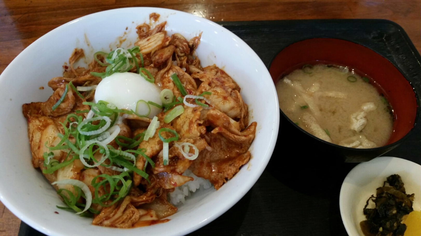 福岡市博多区大博町13-4 092-291-9322 今日は久々にこちらのお店へ。 相変わらず安定の定食屋さんで近くの学生さんからサラリーマンまでいつも一杯の人気店。 どんどん料理を作り、どんどん料理を出していく姿を見ていると気持ちよくなります(笑)。 料理を見ても、高くて700円くらいだもんなぁ。 普通なら500円くらいでしっかり食べれるのだからいいなぁ。 さて今日はもうそろそろ終わりの夏のスタミナ丼という企画料理の中からこちらをチョイス。 もう涼しくなってきましたもんね。 豚キムチ丼550円。 たっぷりの豚肉とキムチをしっかり炒めた丼に温泉卵が乗っている。 食べてみると辛みはあまり感じないキムチとちょっとパサパサした豚肉がなんだか面白い食感になる。 キムチは酸味がしっかりあるので僕好み。 そして濃い味付けでちょっと濃厚でガツガツ食べれるねぇ。 途中で辛みが欲しくて七味唐辛子をかけて食べたけど、ちょっと辛みが増して良いですね。 味噌汁と漬物で最後も〆れたし相変わらずの安定のランチ。 美味しかったです。 次こそ夜に行きたいなぁ。 夜も安い料理が多いみたいだし。 ご馳走様でした。