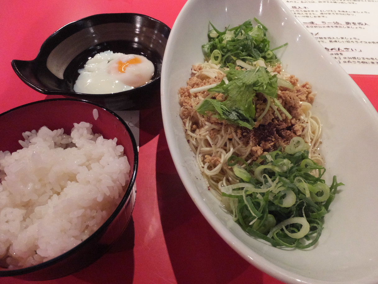 福岡市中央区天神2-14-8 天神センタービルB1F 092-714-4674 今日は本日開店のこちらのお店へ。 広島風の汁無し担々麺を食べれると言うことで楽しみにやってきました。 そしてこの店名。 広島で袋町にあって何度か行ったことがあったあの店なら嬉しいな。 なんて思って入りました。 13時過ぎでしたがお客さんはいない状態。 途中で2組入ってきて安心したけど、まだこれからなのかな。 本日はちょっとサービス品があったのでそちらをチョイス。 汁無し担々麺+小ごはん+温泉卵630円。 普段は680円と言うことだけど、今はサービス価格となっている。 しかし汁無し担々麺を見て驚く。 これって、あの赤鬼ではないよね・・・? ちなみに辛みは室生で一番辛い4辛にしてもらったら山椒の粉がたっぷりと。 しかしラー油らしき色合いはないし、香菜が乗っているのが特徴かな。 軽く混ぜて食べてみると、やはりそうだ。 山椒の辛みはあるけど唐辛子系の辛みはない。 ラー油は入っていないようなので、「木村本店」さんと作り方がとても似ている。 タレに出汁感が強く感じるのとジャンクさがストレートなのが特徴かな。 でも辛みが無いのと山椒の辛みが弱いのでちょっと弱い。 麺はパキパキしていてちょっと面白い麺でした。 パクチーは良く合いますね。 香りが山椒と合うので、別盛りか大盛りが欲しいな。 最後は担々麺のタレとご飯で担々ご飯にしたけど、ここで一味唐辛子を投入。 でもやっぱり物足りないかな。 でも久々に汁無し担々麺を食べれて良かった。 また次も行きたいな。 ご馳走様でした。