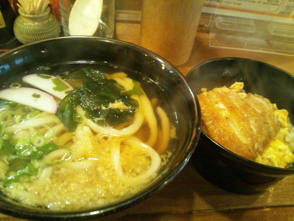 福岡市博多区須崎町5-9 092-402-9888 今日は面白いうどん屋さんへ。 こちらは普段、ゲストハウスとして使われており、海外の人や若い人がお客さんとしている。 夜だけのお店だと思っていたのですが、偶然前を通るとランチをやっていた。 入ると意外と奥に広いお店でゆとりがあるお店だなぁ。 メニューを見るとうどんが当然メインになってくる。 でも丼物も多いね。 その中で僕はこういったセットがあったのでチョイス。 ミニカツ丼セット600円。 たっぷりのうどんとカツ丼のセット。 カツ丼は豚カツがちょうど半分になっていたね。 うどんは讃岐系のしっかりした腰のうどんだね。 ちょっと太めでごつごつした食感が面白い。 具もこの値段でかまぼこやワカメ、葱にたっぷりの天かすが入っているのが嬉しい。 汁は結構甘めで懐かしい感じの味わい。 甘みがきつねうどんを思い出すね。 カツ丼はカツがちょっと風味が不思議な感じ。 卵もちょっと柔らかい部分もあってがつがつ食べれる丼ですね。 美味しいセットでした。 ありがたいメニューが多いね。 次は夜に行ってみたいな。 ご馳走様でした!