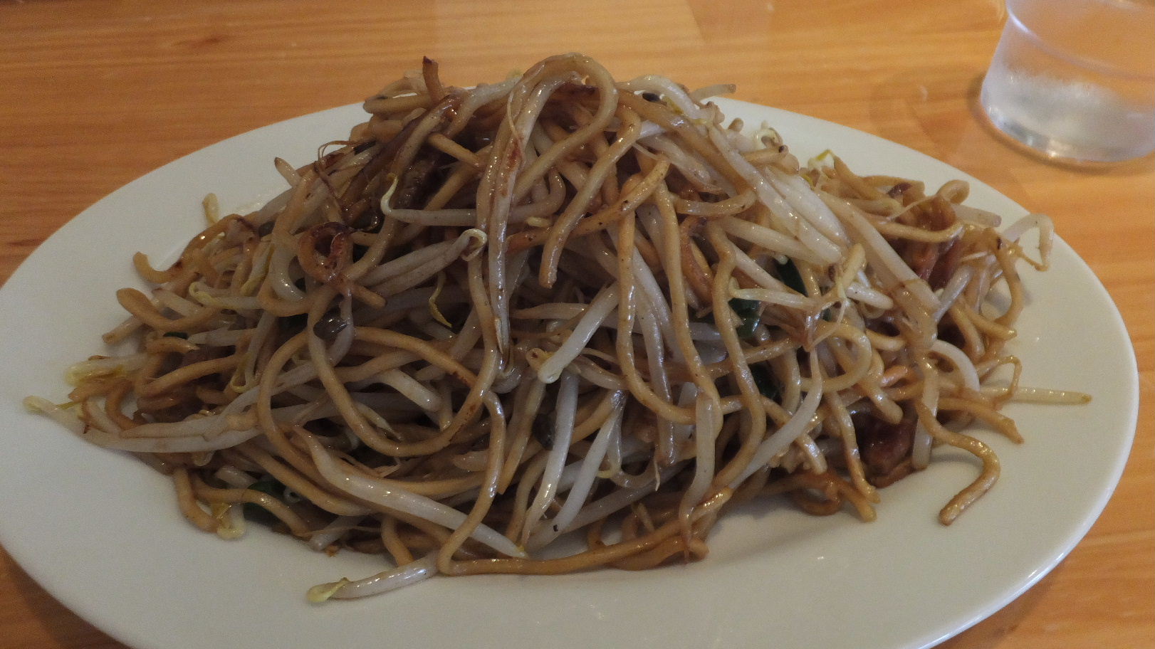 福岡市西区生の松原1-20-32 092-883-5033 今日は焼きそばで有名なこちらのお店でランチ。 大分だっけ? そこが発祥の焼きそばらしく現在ではかなり沢山のチェーン店や暖簾分けをしているらしいです。 確か広島にも暖簾分けのお店があったと思うけど僕は行かなかったんだよね。 こちらは少し行列が出来ていたくらい人気店。 子供連れや家族連れが多かったのは地元に密着もしていると言うことだろうか。 メニューはシンプルに焼きそばと餃子と後は簡単にご飯やビールくらい。 シンプルで良いね。 ってことで僕もシンプルのこちらを。 焼きそば840円。 わりとたっぷりあって普通のお店では大盛りに近い量ではないだろうか。 この量なら840円ってのも納得かな? 初めは少し高いなぁ、なんて思ったのですが(苦笑)。 焼きそばは肉も使っているけどほとんどソバともやしがメインだね。 麺は揚げ麺のようにカリカリした麺とムチッとした食感が併せ持っていて面白いね。 具のもやしは先端の部分がちょっと口に残ったのだけどしゃきっとしたもやしで旨いね。 ソースは醤油が強いのかな? しっかりした味わいの中に少し酸味が残って面白かった。 ちょっと後半は油が強い気がして辛くなったけど、これはおっさんだからかな? 美味しい焼きそばでした。 次は、ビールを呑みながら食べてみたいな。 ビールで油っぽさを流して食べるなんて最高だもんね。 ご馳走様でした!