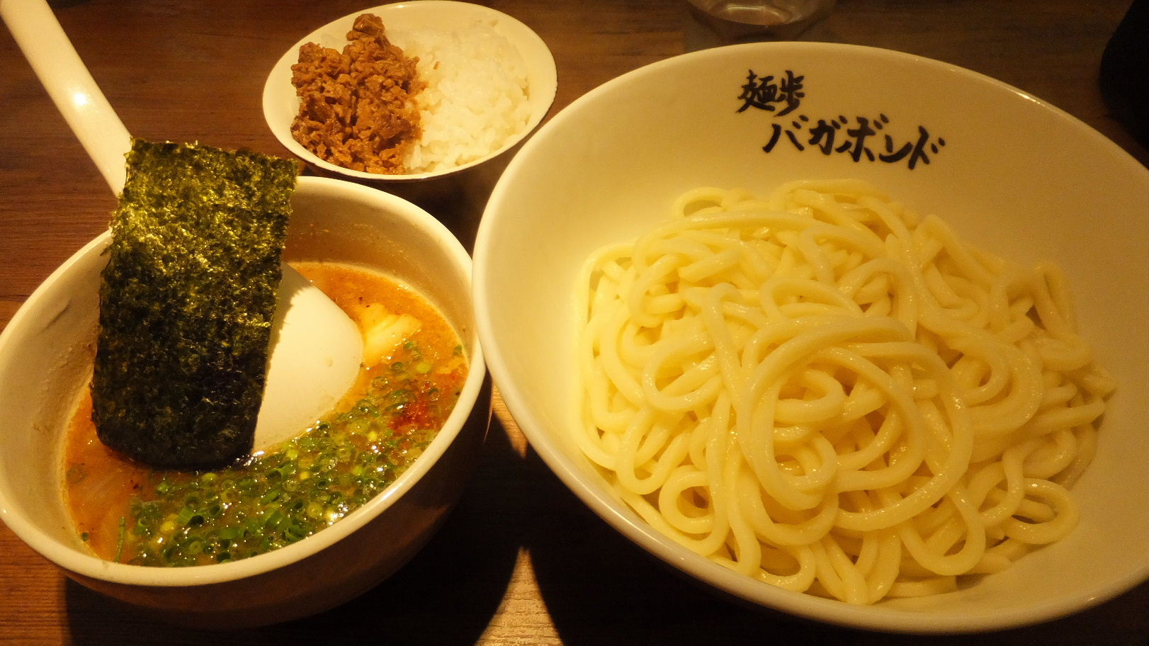福岡市博多区博多駅前2-10-12 092-233-1192 今日は面白い名前のラーメン屋さんへ。 こちらは鹿児島に本店があるそうですが、とても人気店と言うことで行ってみたかったんですよね。 お店はランチタイムでも一人で回されており、13時半くらいに行ったのですが、お客さんは結構いました。 この状況でもお客さんを捌ききれているのが凄いなぁ。 こちらのお薦めはラーメンだけでなくつけ麺と言うことで、周りの人は炙ったチャーシューのつけ麺を頼んでいた。 とても香ばしい香りでいいなぁ、なんて思ったのですが少し高かったのでこちらをチョイス。 せっかくなのでセットで。 つけ麺700円+チャーシュー飯100円。 麺は大盛りも無料と言うことで考えたのですが、茹で上げ後600gという破壊力にビビッテしまい中盛りを。 それでも500g近くあるそうな。 麺はあつ盛りでお願いしたのですが、見てびっくり。 うどんのような太さと白さの麺に目が点になった。 つけ汁はとても複雑な香りがして旨そうだ。 早速すすって見ると驚くくらい汁が旨い。 豚骨だけではないだろう、スープがベースに魚介系がしっかり上乗りしている。 魚粉もカツオっぽい香りがあるし、それに生姜や玉葱の甘みも加わっている。 ちょっと濃厚で塩分も強いけど飽きさせない旨さがあるなぁ。 底の方には香ばしいチャーシューが沈んでいてこれも脂がしっかり効いていたけど旨かった。 麺は太さがあったけど意外と優しい麺。 ほんとにうどんをイメージしているのかな? なんて思えたな。 チャーシュー飯はほぐしたチャーシューがけっこう入っていた。 甘いタレがしっかり効いていてスープに合わせにくいけど単品として考えると問題なし。 ってより100円で弧のクラスが出てきたら幸せだ。 美味しいつけ麺でした。 つけ麺って・・・、ってイメージもあるのですがここなら納得でした。 次はラーメンも食べてみたいな。 ご馳走様でした!!