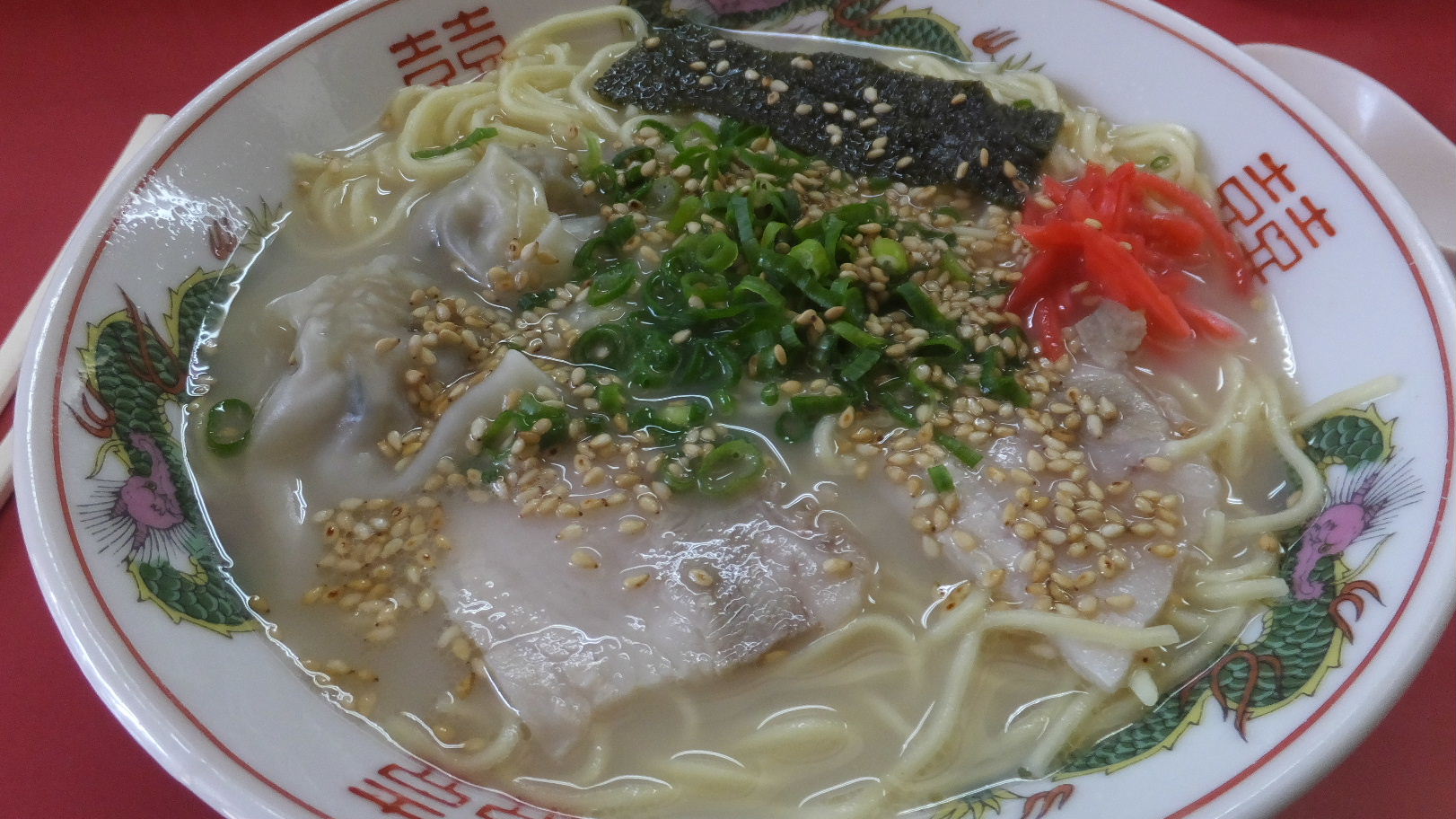 福岡市西区姪の浜4-11-23 092-881-0456 今日は、姪浜で歴史がありそうな中国料理屋さんへ。 とてものんびりした雰囲気のお店でお店のお母さんらしき人が座っておられた。 僕が入ると急いで立ち上がってくれてなんだか申し訳ない気持ちが(笑)。 メニューは麺類がメインで少し定食系や丼系もあったかな。 町の中国料理屋さんって感じで良いですね。 さて僕はこちらをチョイス。 ちょっと気になったので。 ワンタン麺550円。 ワンタンは注文をしてから包んで湯で始める。 スープは少なめだけど麺もたっぷり、ゴマがたっぷり。 ワンタンは3個、チャーシューに葱、海苔と始めから紅生姜がのっている。 スープはあぁ、懐かしいジャンクなスープだ。 豚の味わいが軽くするスープにはジャンクな味付けで懐かしい。 麺も懐かしい中華麺でホッとする味わい。 ワンタンは多分餃子用の具ではないだろうか。 かなりニンニクや生姜が効いたワンタンはちゅるっとした皮に強い味わいの具材がたまりませんな。 チャーシューは柔らかく脂が強いタイプ。 良いお店ですね。 次は皿うどんを食べてみたいな。 他のお客さんが食べてたけど強い餡で面白そうだったなぁ。 ご馳走様でした。