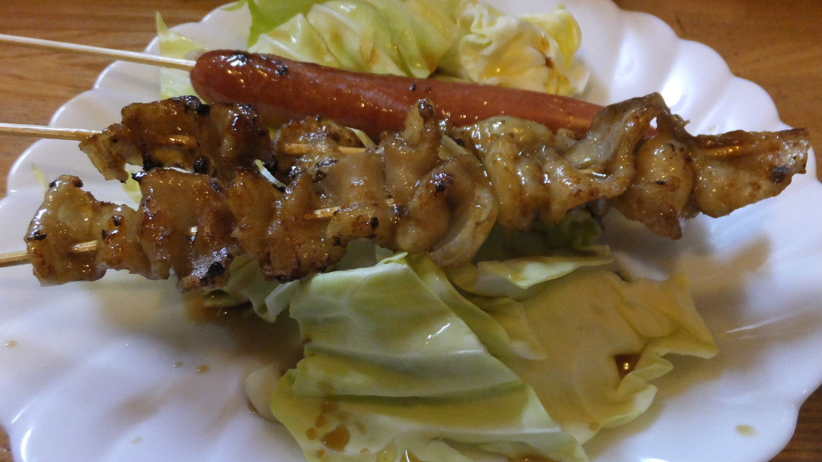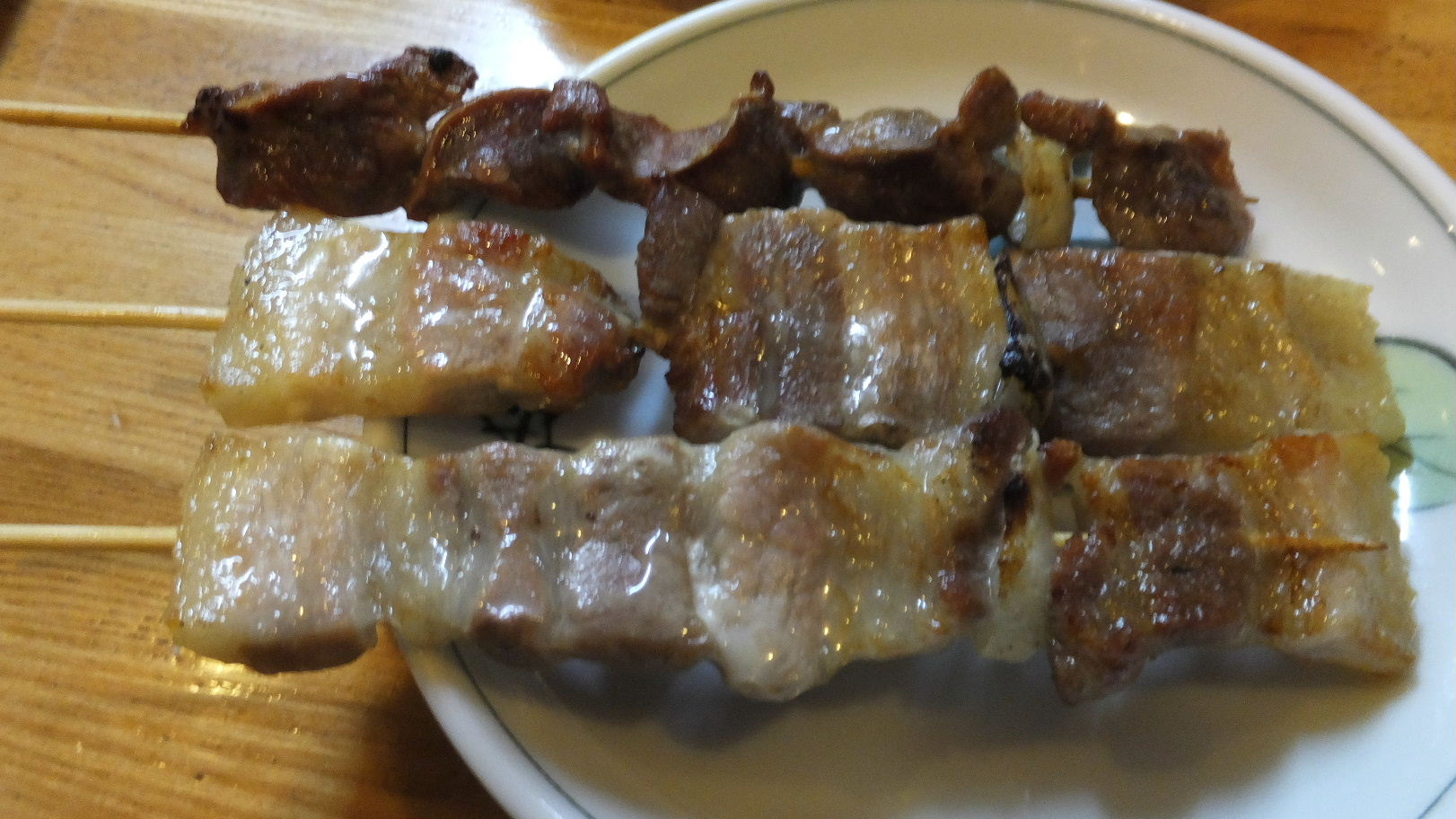福岡市城南区干隈1-16-15 092-863-7368 今日は、ちょっとしたイベントの後に立ち寄った居酒屋さんへ。 見た目は地元ののんびりした居酒屋さんって感じですね。 カウンターもあり、テーブル席もあり、家族で食べている人もたくさん居た。 お店は焼き鳥やちょっとした刺身もあるね。 さて僕はまずセットメニューを。 お得感があるので気になって。 セットF1,000円。 つきだしと焼き鳥6本、そしてお酒1杯のセット。 つきだしは撮り忘れたけど、スパゲティ入りのポテトサラダでマヨネーズの強いサラダでした。 お腹にたまりそうなサラダで嬉しかったなぁ。 そして焼き鳥は随時出てくる。 まずはソーセージと皮から。 タレが結構甘いタイプでしっかり味付けられている。 クニクニした皮とジャンクなソーセージ。 ありがたいね。 残りは砂肝(ズリ)と豚バラ(バラ)。 さすがに福岡。 焼き鳥やさんでは豚が置いてある。 脂がかなりついていて甘さがしっかりしているね。 砂肝は臭みなんて全くない。 コリッとした食感が良いですね♪ 中華そば400円。 メニューには500円と書いてあったのですが、中華麺が無くてチャンポン麺しかないので400円で良いよ。 なんて言ってくれてありがたく注文。 見た目はチャンポンですね。 あっさりしたスープは鶏の味わいがするあっさり出汁。 そこに野菜の甘みが出て意外にも美味い(失礼)! しかし塩分は強めですね。 そこもお酒がメインだからかな? なかなか良い店だったなぁ。 これだけ食べて呑んで1,400円。 わかりやすい値段ってのも嬉しいね。 ご馳走様でした!