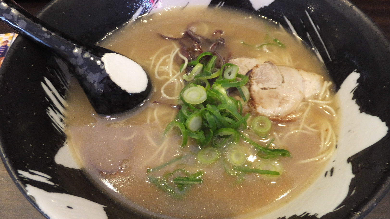 博多区対馬小路2-10 092-292-0597 今日はランチを食べれるか食べれないかの時間。 15時を過ぎて開いているお店なんてかなり少ない。 そんな時にありがたいのは通し営業をしてくれているお店。 さて今日は会社の近くにあるこちらへ。 こんな時間に行ったのですがお客さんは多かったですね。 場所が悪いだけに心配してましたが、今の調子で行けたらいいですね。 僕は餃子のセットを頼もうとしたら餃子が売り切れ・・・。 まぁ時間も時間ですしね。 ではこちらを。 炒飯セット750円。 黒豚骨ラーメンと半炒飯セットとなる。 ラーメンは、見た瞬間ビックリ。 前回よりももっととろみが強くなっていた。 スープを頂くと粘り気だけでなく豚の味わいもしっかりと強くなっていた。 これはゼラチン質の強い部分を強化して作っているのかな? 純豚骨と言っていたけど、これは面白い組み合わせだなぁ。 冷えてくると口の中がにぇちゃにぇちゃしてくるくらいのスープは特徴が強いね。 面白い風に変わっていた。 僕は今のスープの方が好きだ。 麺はしゃっきり細麺、具は変わらず美味しいと思った。 半炒飯。 かなり綺麗に炒まっていた炒飯。 ぱらりとしていて美味いな。 でも、このラーメンには少し味が強いかも。 美味しいもの同士は強すぎて組み合わせられない物なんですねぇ。 やっぱり好きなお店でした。 また行きたいな。 次こそ餃子だ。 ご馳走様でした!