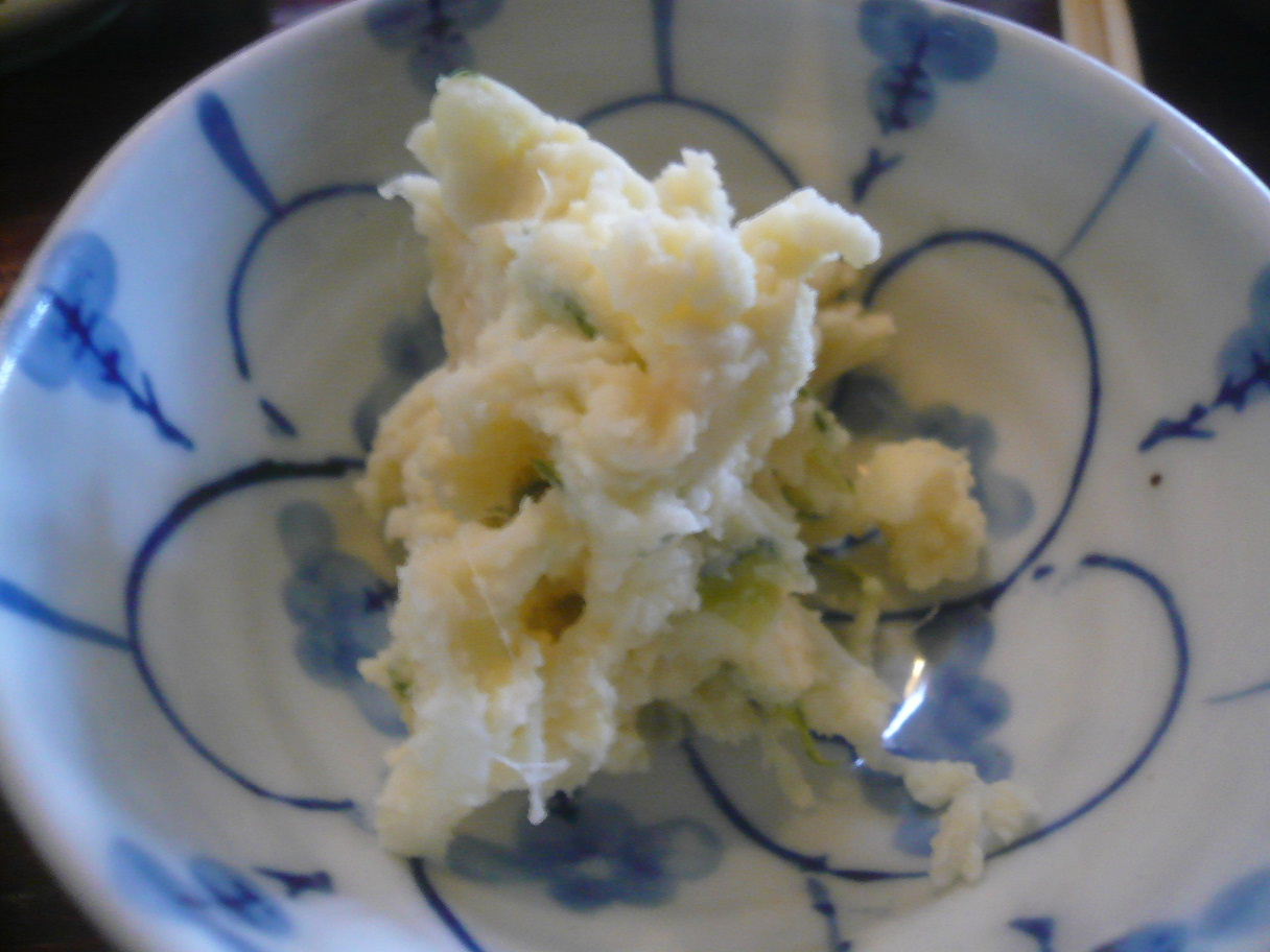 福岡市西区今宿上ノ原163 092-807-4228 今日は今宿のバイパスから山を登った所にある蕎麦屋さんへ。 バイパス当たりから看板があっていつか行きたいな。 なんて思ったのですが、どうせなら行ってみたいと思ってたんですよね。 自転車で行ったのですが、思った以上に遠くて意外でしたが何とかたどり着きました。 膝を痛めている僕にとっては辛かった。 さてお店は古民家を改装したのかな? 店内は木造の歴史ありそうな雰囲気に。 色んなインテリアというか古風のものがあった。 天井には風車の様な物まであった。 面白いな。 さてお腹が空いているので店内の説明は置いておいて。 料理と行きましょうか。 つきだしで出てきた里芋の天麩羅。 ちょっと冷めているけどカリッとした表面にトロリとした柔らかい里芋。 軽い塩味でつまみ的な感じ。 つきだしとしてはちょうどいいですね。 もりそば800円。 器が綺麗ですね。 もりそばは皮ごとひいた「黒」と皮を綺麗に取った「白」があるようだ。 せっかくなので個性がありそうな「黒」をチョイス。 確かに見た目は黒っぽいですね。 蕎麦はわりと細め。 薬味は辛み大根、葱、ワサビ。 蕎麦を食べてみると香りがとても強い。 これは皮の香りなんでしょうか。 しかし雑味というかちょっと蕎麦っぽくない強い味があるのが面白いね。 汁は塩分が強いけど味わいはあまり主張しないね。 蕎麦に合っているかはちょっと分からないけどこれもこのお店の個性かな。 最後に何故かポテトサラダも出てきた。 マヨネーズ少なめのあっさりしたポテトサラダ。 和食屋さんで出てくる優しい物でした。 野菜も甘くて旨いね。 最後にかなり濃いめの蕎麦湯が出てきてフィニッシュ。 胃の中まで温かくなって嬉しいね。 美味しい蕎麦でした。 少し高いかな、って思ったけどこれだけ色々出してもらったら有り難くさえ感じた。 次はお酒のつまみも食べながら・・・。 って遠いから難しいかな(汗)。 ご馳走様でした!
