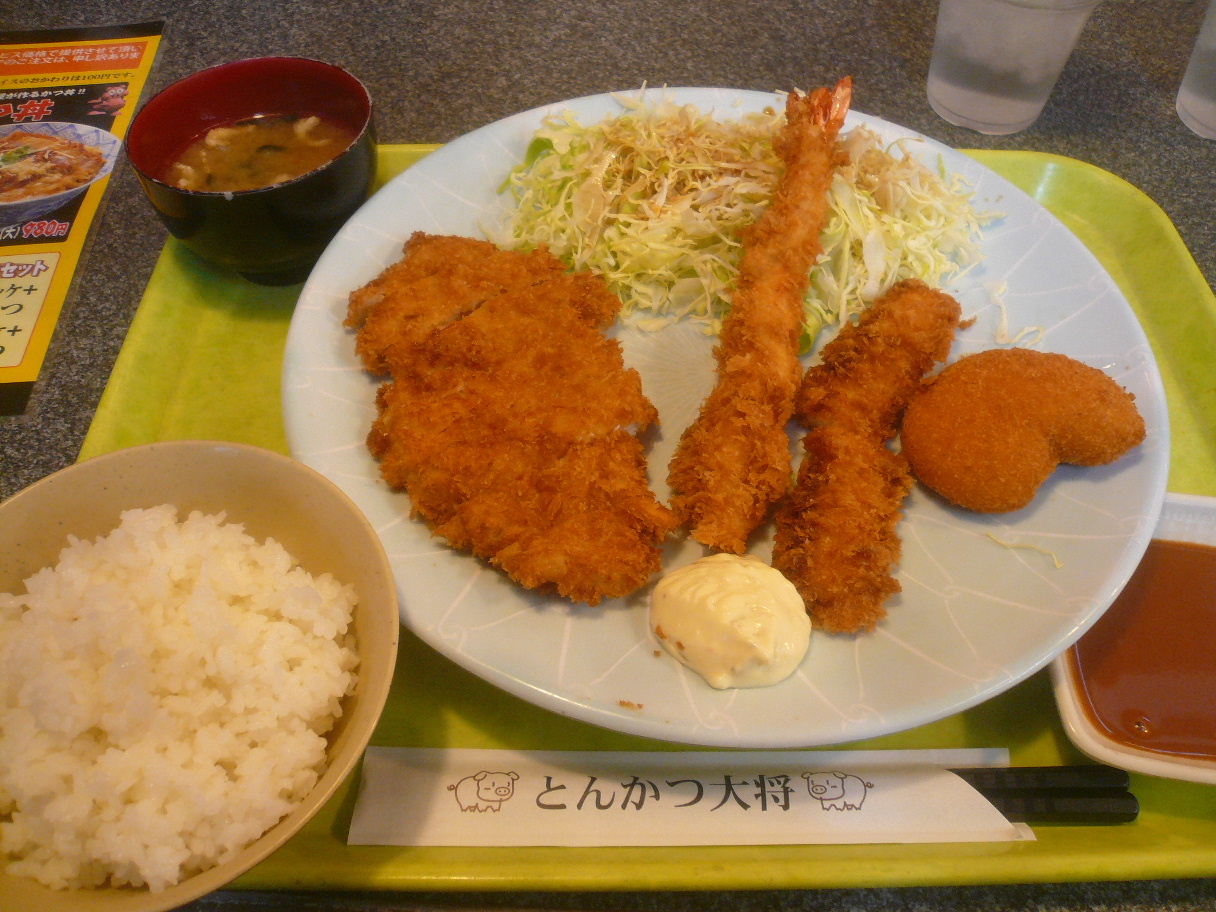 福岡市博多区東光寺町1-2-13 092-451-2233 今日は博多駅からちょっと行ったところにある豚カツ屋さん。 駐車場もあるので車で行ってもありがたいよね。 お店は簡易な造りでなんだか気軽に入れるね。 カツ丼を食べようと入ったのですが、どうも様子が変。 あまりに色んなメニューが安いのと。 周りにボリュームをうたっている。 これは気をつけて頼まないとまずいぞ・・・。 さて僕は日替わりのこちらをチョイスすることに。 日替わり680円。 ちょっと覚悟をしていたけどかなりのボリューム。 たっぷりご飯に野菜は嬉しいけど。 一枚物の豚カツに海老フライ、イカフライ、クリームコロッケが付いてくる。 そこに味噌汁が付いてこの値段。 街中で・・・。 豚カツは厚みが8mmくらいある脂身もしっかりある肉。 ちょっと表面に付いた油がちょっと癖があるというか匂いが悪い。 まぁ16時くらいに行ったのでかなり疲れた油になっていたのかも。 おかげで夜は胃がもたれた。 海老フライは立派な大きさの衣がちょっと・・・、だけどぷりぷりしていて美味しかった。 イカは冷凍系かな? クリームコロッケも冷凍系かもしれない。 しかしお腹一杯になった。 この値段で街中で食べれると思ったら凄いことだと思う。 次はカツ丼を食べたいな。 ご馳走様でした! PR