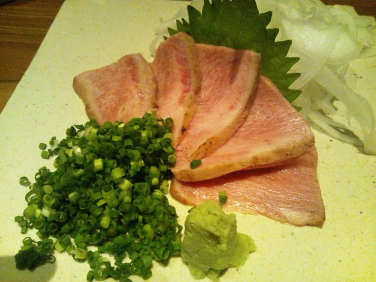 福岡市中央区天神1-15-3 092-741-0629 今日はひょっこり立ち寄ったお店へ。 実は別のお店へ行くつもりだったのですが、そのお店が満員だったため偶然こちらに行くこととなりました。 こちらは広くはないですが、どうやら2階があるようでちょっとした人数でも対応が出来るみたいです。 こちらのウリは看板に焼き飯とタン料理のようですが。 生肉系がたくさんメニューにもあったので、肉料理のお店と思えばいいのでしょうか。 カウンターには生肉が見れるようになっていて、こういったのは肉好きにはたまらないだろうな。 肉をあまり食べない僕も、ちょっと見とれていました。 さてまずはお酒と共につまみでも。 自家製キムチ400円。 キムチもお勧め、と聞いていたのでチョイス。 綺麗な白菜キムチだけど、味わいはなかなか凶暴。 キムチって色んな味わいや酸味でまろやかになっているけど。 こちらは辛みがしっかり効いていて、結構浅漬けな気がする。 これは肉の味わいに負けないようにしているのかな? あっという間にビールが進みました(笑)。 タン刺し(ハーフ)750円。 ちなみに通常サイズだと1,200円。 僕が一人だったので少なめにしてくれた。 甘みすら感じる牛タンはたまりませんな。 これに甘口の醤油や薬味をつけて食べても美味しいし。 そのまま食べても美味しい。 こりゃ炙りも食べてみたいな。 でもココでお客さんが一杯になったので席を譲ることにした、 こういったお店を独占するのは失礼だしね。 また行きたいな。 次は炙りの料理も頂きながら。 ご馳走様でした!