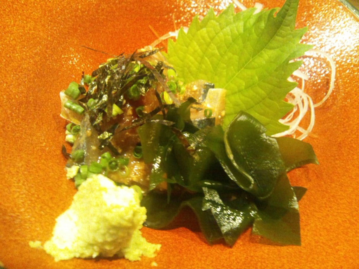 福岡市中央区平尾1-12-28 092-531-6386 今日は再びこちらのお店へ。 2軒目だったのですが、やっぱりもう一度落ち着いていきたかったのだよねぇ。 お店はやはりお洒落ですね。 しかし台風の影響かカウンタに座れたのはありがたかったね。 料理は何品か食べたのですが、写真はほとんどがぶれぶれ。 困ったものだ(汗)。 とりあえず綺麗に撮れた写真だけを。 つきだし。 鶏のたたきがつきだしで出てくるのも凄いけど。 味わいも凄い! 濃い鶏の味わいなのに嫌らしさがないね。 これをゆっくり食べながら温かいお酒を呑むなんてたまらないですね♪ 味付けもシンプルに淡くつけられていた。 表面はイクラがちりばめられている。 そこには柔らかい茶碗蒸しのような食感の柔らかい下地が作っている。 とても濃い味わいの下地にはなんとフグの身を使っているらしい。 イクラ自身も濃い味わいなので面白いね。 しかしこの料理はほの温かいのでホットするのですが。 ちょっとイクラの皮の固さが気になったなぁ。 他にも素晴らしい秋刀魚や鯛の天麩羅など。 美味しいものを頂いた。 お酒も燗酒から冷やに合うヤツまでしっかりと良いお酒。 またはまりそうだな。 ご馳走様でした!