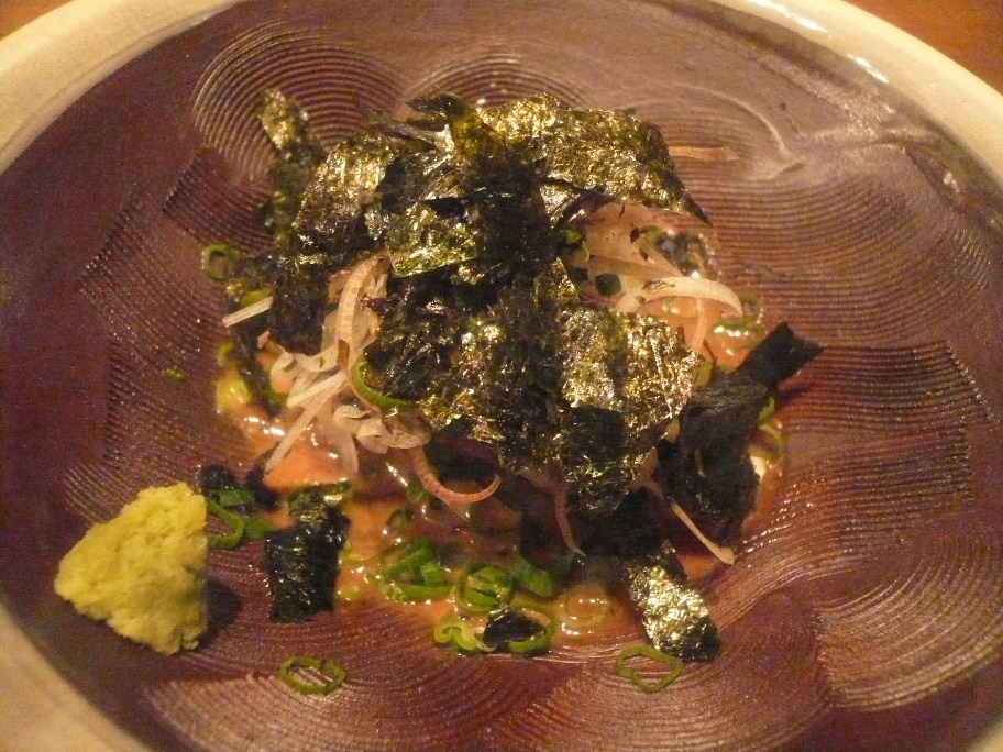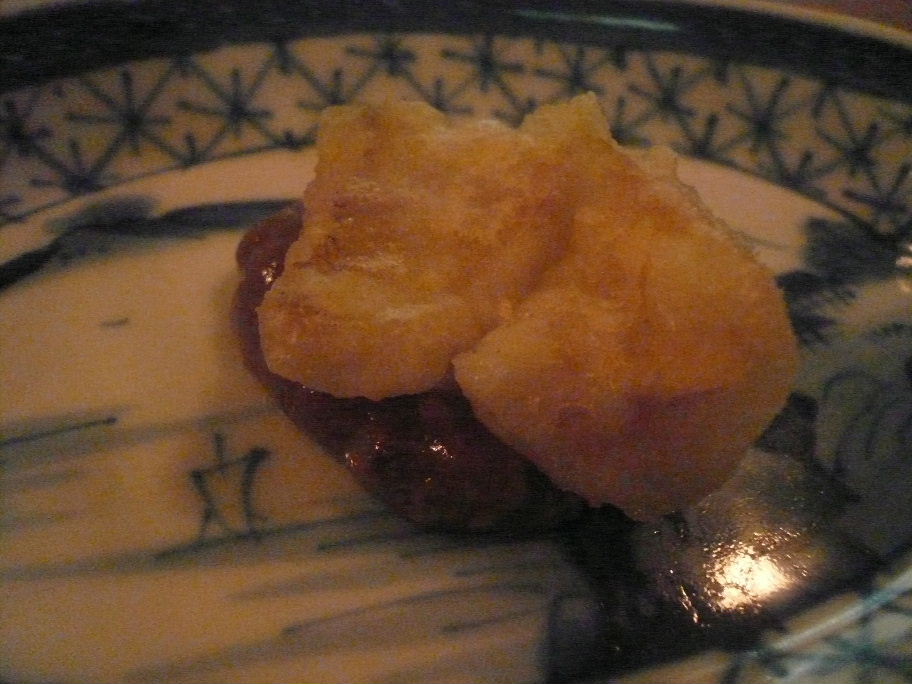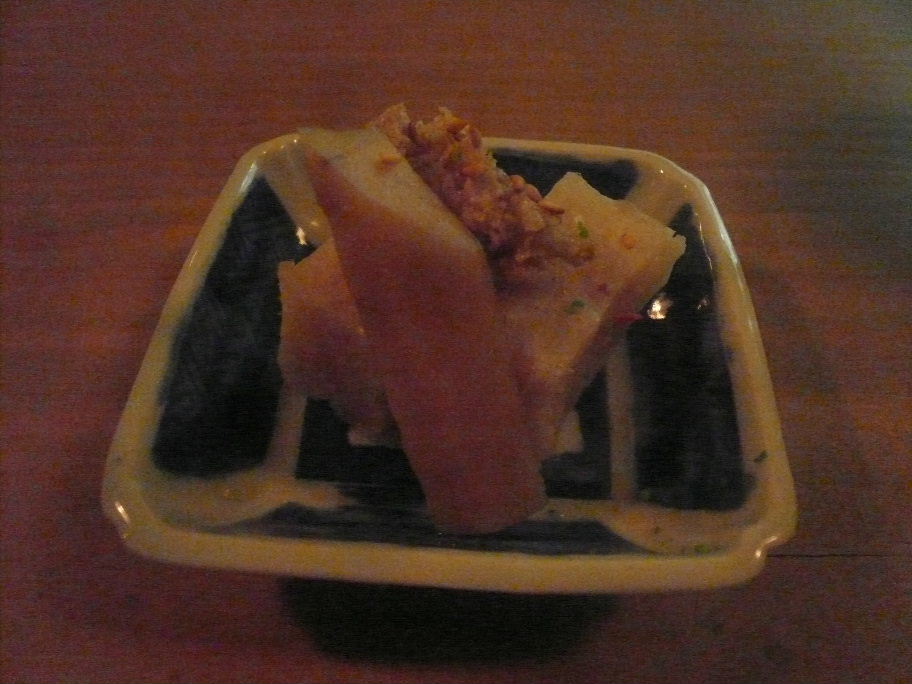 福岡市中央区平尾1-12-28 092-531-6386 今日は『二○加屋 長介』 の後にこちらのお店へやってきました。 こちらは、和食というカテゴリーが正しいのでしょうか? とても落ち着いた雰囲気のお店で、そしてとてもわかりにくい場所にある。 そこが隠れ家的な雰囲気となるのでしょうか? お店の人も和服なのですがお洒落な感じ。 暗い店内になんだか良い雰囲気を感じさせます。 料理は軽くつまむ程度。 こちらのお店が好きという人に料理はお任せしました。 つきだし・・・、かな? 煮凍りと言うべきなんでしょうか? ネットリとした食感ですが、硬めの仕上がり。 味わいもしっかりしているので、これは・・・。 肉? 不思議な味わいでした。 また食べたいな、落ち着いて。 これは何だろう・・・? 上に乗っているのはホロホロとした魚。 白身で・・・、なんだったんだろう? アコウ? 下地も香りが高い、キノコの様な香りがあった。 どれも不思議な料理だなぁ。 とても上品で美味しいのですが、ちょっとだけいたずらっぽい雰囲気もある。 ってよく分かりにくい表現ですよね(笑)。 またゆっくり落ち着いて食べてみます。 今回はこのお店を知っただけで。 貴重な経験だと思ってます。 そしてもう少し感性を高めて食べてみます(汗)。 ご馳走様でした!