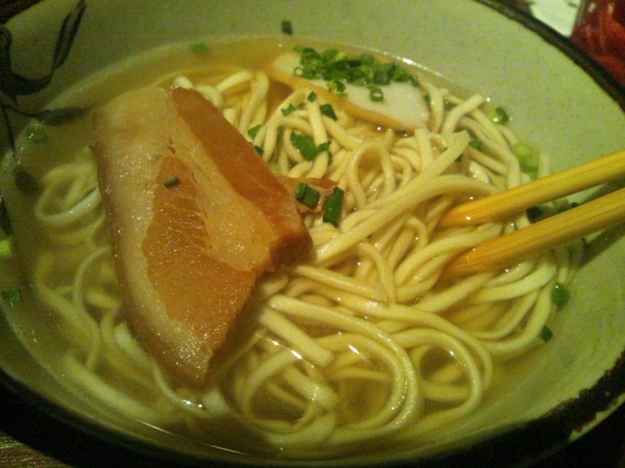 沖縄県那覇市松山1-12-10 098-863-5758 今日は沖縄そばを食べに。 もう3食目ですね(笑)。 今回は呑み屋街松山で食べる沖縄そばを。 本当は別のお店を紹介したかったらしいのですが、そちらは休みだったらしいです。 こちらも有名なお店らしい。 野菜盛りやら小盛りやら色んなメニューがあるけど女性にも優しい店ってイメージですね。 さてこちらはどんな沖縄そばを食べれるのでしょうか? 沖縄そば600円。 今回の3軒の中で一番細いかも。 しっかりごつごつした麺は今回の中で一番好みかも。 呑み屋街らしく出汁は塩分が少し強いかも知れないね。 出汁感が強くないからかも知れないけど、そう感じた。 でも事実酒を呑んでいただけにとても身体には合っていた。 ソーキはトロトロで美味しかった。 これはもう一枚食べたいなぁ(笑)。 こちらのお店は22時OPENでこの値段は嬉しいね。 また食べたいなぁ。 ご馳走様でした。 |