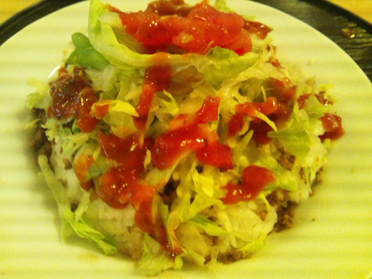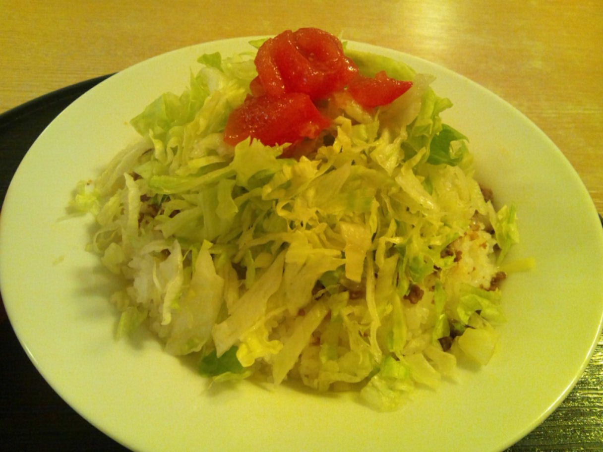 沖縄県豊見城市字根差部710 098-850-2228 今日のランチはこちらへ。 何処に行こうかな、なんて思っていたら連れて行ってもらったお店。 沖縄そばがメインらしいのですが。 ちょっと変化球をかけたいな(苦笑)。 なんてメニューを見ていたらあるある。 さてこのメニューを伝えたらかなり驚いた顔をする店員さん。 えっ、珍しいの(汗)。 やっぱり沖縄そばなの!? タコライス500円。 挽肉の上には少しチーズが載っていてその上からたっぷりレタス。 トマトが乗っている。 味付けは? って思ったら。 ホットドックであるケチャップソースのチューブに入ったトマトソースをかけて食べるらしい。 かけようと思ったけど、粒の入ったトマトソースだけに詰まっている。 思いっきり押したら飛び散った。 無惨、僕のワイシャツ(大涙)。 味わいはトマトソースがちょっとピリッと感。 どうやらタバスコが入っているのかな? 酸味もあるけど、ご飯には合うかどうかはちょっと判らなかった。 後は濃く味付けしている肉でレタスを食べながらご飯を食べる感じかな? 僕にはタコライスの奥深さはまだ判らなかったな。 次はタコライスの研究だね(苦笑)。 ご馳走様でした。