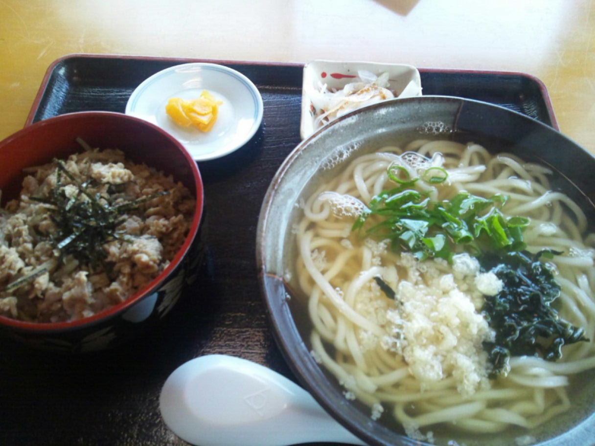 佐賀県神埼郡吉野ヶ里町石動2662-5 0952-52-2272 今日は佐賀へ出張。 実は佐賀ってほとんど行ったことがない。 何が名産なんだろう? 確か鶏系が旨いと聞いたな。 なんて思ったのですが、取引先の人に連れられたお店へ。 お店は「自家製麺」が大きく出ている。 さて今日はこちらをチョイス。 ちょっとお腹が空いていたしね。 せせり丼セット680円。 そぼろのせせり肉とうどんのセット。 まずはうどんから。 麺はとても柔らかい。 これは福岡風うどんと言うべきか。 いや、ここまで細くはないか。 ここの独特の食感なんだろうなぁ。 腰って物はないけど優しい感じで体調が悪いときに良さそうだ(笑)。 出汁はとても軽い感じ。 でもちゃんと昆布の香りがする。 これまた不思議な出汁で柔らかさがとても出ていて面白かった。 せせりはあまりよく分からないというか。 そぼろにしたらわかりにくいね。 味はそこまで濃くないのでジャンク感はないけど、これは面白い。 付け合わせにさらし玉葱というのも不思議。 面白いお店でした。 なかなか行けない場所ですが次はうどん単品を食べてみたいな。 ご馳走様でした。
