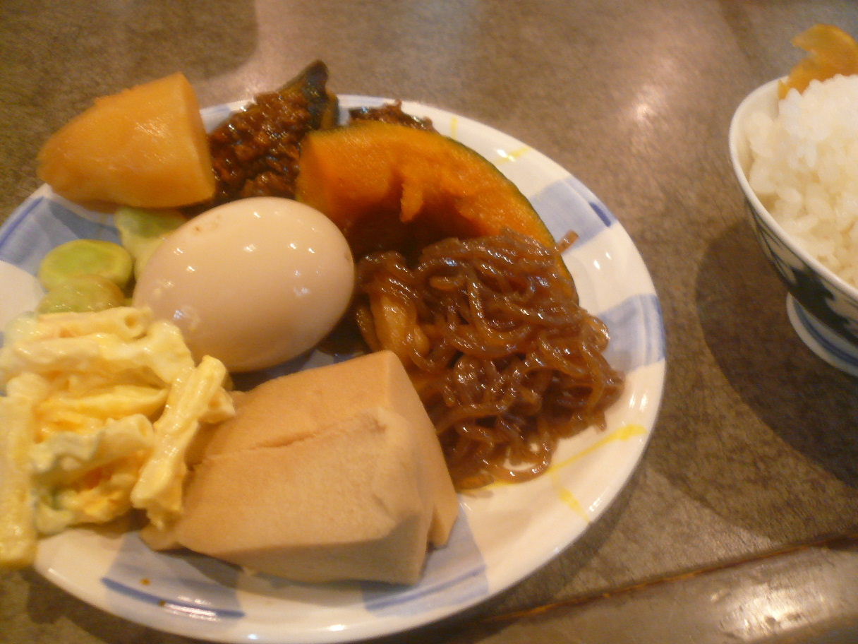 福岡市博多区対馬小路5-1 092-271-6109 今日はなかなか気づかなかった喫茶店。 あれ?こんなところでランチをやっていたんだ! って驚いた感じだ。 しかし入ろうとしてちょっと躊躇。 日替わりランチが800円って喫茶店系のランチとしてはちょっと高いな。 なんて思ったけどせっかくなんで入ってみた。 お店はホントにのんびりした感じの喫茶店。 漫画が置いてあって、コーヒーを飲んでゆっくりしているお客さんもたくさん居た。 まずカウンターには色んなおかずが置いてあったのだけどこれは・・・? って思ったら日替わりを頼んだ人はバイキングスタイルでおかずが好きなだけ頂けるらしい。 「人件費削減よ」 と料理をしていたおばさんが笑っていた。 沢山おかずがあってどれも手作りな感じがした。 僕は肉じゃが、茄子のピリ辛炒め、カボチャの煮物、空豆、味付けゆで卵、糸こんにゃくと豚の煮込み、マカロニサラダ、高野豆腐をもらった。 どれも特別な味わいではないけど、これだけとれるると嬉しい。 これでビールとかも呑みたくなるね(笑)。 さて日替わりのメインは豚の生姜焼き。 これも豚がたっぷり。 そしてあまり甘くなく生姜がしっかり効いた美味しい豚の生姜焼きだった。 それが3枚も。 脂身もそこまで強くないのが嬉しいね。 後はご飯と味噌汁がついてくるんだけど、ご飯もぷりぷりで美味かった。 ココは良いなぁ。 最後にコーヒーがついてきて終了。 これで800円は安いな。 ちょっとビックリした。 次はまたランチを食べたいな。 他にもカツ丼とかもあったっけ? その時も色んなおかずは食べて良いのかな? ご馳走様でした!!