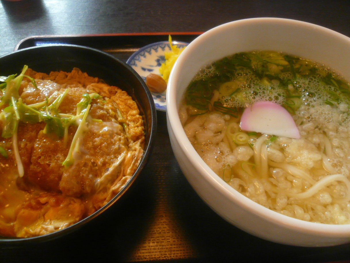 福岡市西区上山門1-3-20 092-884-0705 今日はちょっと気になっていたうどん屋さんへ。 「大地のうどん」さんとかが近くにあり、また自宅から近いのでいつか行こうと思っていたのだ。 古めかしいお店だけど入ってみたら中はちゃんと掃除されていてとても居心地は良い。 お店のメニューを見ると大盛りも同じ料金というありがたい事を書いてあった。 とりあえずまずはお店のお薦めを聞いてみてこちらをチョイス。 カツ丼セット680円。 うどん屋さんでまさかのお薦めがカツ丼メイン(笑)。 でもカツ丼とミニうどんのセットなのに「うどんは普通盛りに変えても同じ料金よ」 と素晴らしい提案をしてもらった。 結果凄いボリュームとなった(笑)。 うどんは麺が意外と細く平べったい綺麗なうどん。 プルッとした食感がなかなか気持ちいい。 昔ながらのうどんと思ったらちょっと違った。 美味いと思う。 カツ丼はかなり甘めの味付け。 卵も結構硬めだけどそれ以上にカツが分厚い。 その分厚さで驚かされる。 かなりぱさついたカツになっているけど、甘く濃い味付けには良く合っている。 タレも沢山はかかっていないのが嬉しいね。 鶏だんご蕎麦530円。 こちらも大盛りでチョイス。 蕎麦は結構柔らかめで蕎麦の香りもほとんど無い状態。 でもこういった蕎麦も嫌いではない。 そして汁がうどんの時より塩分が強くないので良かった。 鶏だんごは生姜がかなり効いていて旨い。 でも生姜を使っていてもちょっと鶏の癖は気になったけどね。 お腹一杯になれるので嬉しいランチでした。 味もよかったし好きになりそうだ。 次は凄いメニューを見つけているのでそれをチャレンジしてみようかな。 「ウインナーうどん」(苦笑)。 ご馳走様でした!