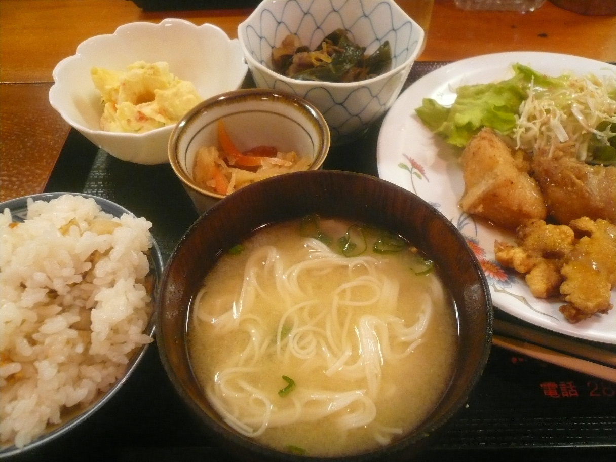 福岡市博多区神屋町6-18 今日はこちらでランチをチョイス。 なんだか古いタイプの定食屋さんって間違いが無くて好きなんですよね。 入るとお酒を呑みながら定食を食べる人。 たばこを吸いながら食事をする不思議な人。 色んな人がいるなぁ。 ランチはお任せの定食がメイン。 よく見ると人によって料理がちょっとずつ違う。 ある材料でどんどん作っておられる。 面白い感じだなぁ。 お任せ 定食600円。 メインは小ふぐのフライ、すき焼き風煮込み、ポテトサラダ、干し大根、味噌汁、ホタテご飯。 これだけあってこの値段は凄いね。 小ふぐのフライは骨の周りをしゃぶりながら食べるのは嬉しいね。 確かにビールを飲みながら食べる人も納得だ。 他の小鉢もしっかり量もある。 味噌汁はにゅうめんが入っている。 それだけでなかなか贅沢。 さらにご飯はホタテご飯。 ヒモの部分も内臓の部分も入っている。 出汁も出ていて美味いなぁ。 こりゃなかなか凄いな。 美味しかったです。 ちょっとお店は綺麗とは言い難いので、そこが気になる方はダメかもね。 でもこのおかず、魅力でしょ? ご馳走様でした!