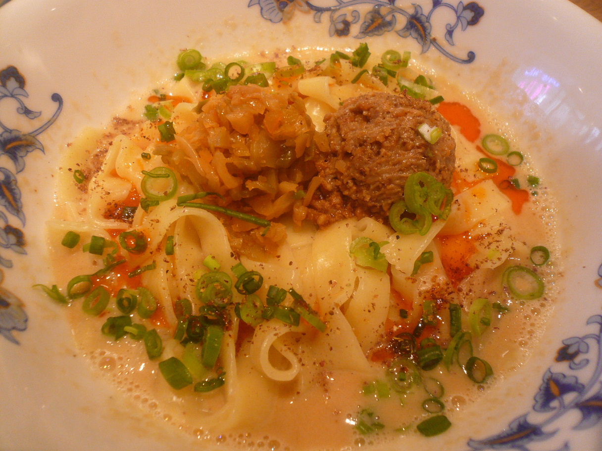 愛知県名古屋市中村区名駅5-18-6 052-485-8039 今日は出張で名古屋へ。 とうとうこの日記も名古屋のご馳走も書くようになったんですね(笑)。 僕は手羽先や味噌カツ、味噌煮込みを食べたかったんですが。 ひょっこりとこちらで食べることとなりました。 お店はカフェ的な感じの中華料理店でお洒落な雰囲気ですね。 売りは鶏白湯のようですが。 今回はこちらをチョイスしました。 汁無し担々麺セット830円。 まずは餃子と御飯とザーサイがまず運ばれてくる。 餃子は塩で食べるのですが。 結構ジューシー系。 ニンニクは入っていないらしいですけど、しっかり味もあって御飯のおかずにもなりますね。 御飯も結構たっぷり入っていて美味しかったです。 汁無し担々麺。 見た目が凄いです(笑)。 ゴマの濃厚な味わいが見てわかりますが。 それ以上に麺が面白いですね。 フィットチーネのような平麺で麺を引っ張ると生麺らしくちょっとちぎれそう。 そろそろと混ぜずに食べてみると。 丸い濃厚なゴマベースですが、意外と重くないのが良いですね。 ゴマ=かなり重いと言うイメージでしたが以外とそうでもなかったですね。 そこにラー油の辛さがピリッとしていて良いアクセントだし。 かなり山椒の香りも効いていて面白いですね。 ザーサイや肉味噌も載っていて途中で混ぜながら食べると味わいがいいですね。 いやぁ、まだまだ知らない担々麺があるものですね。 面白かったです。 簡単にまた行けないですが、評判になって欲しいですね。 ご馳走様でした!
