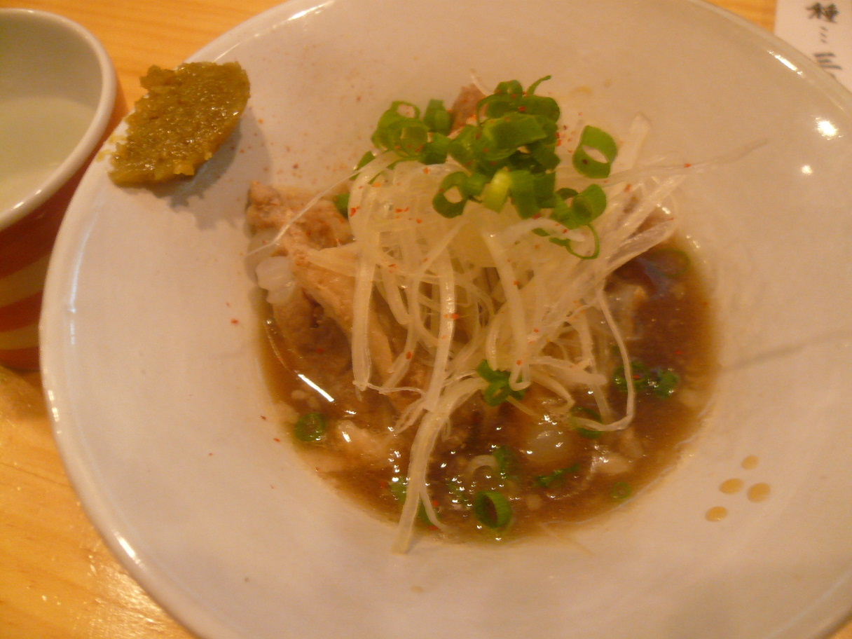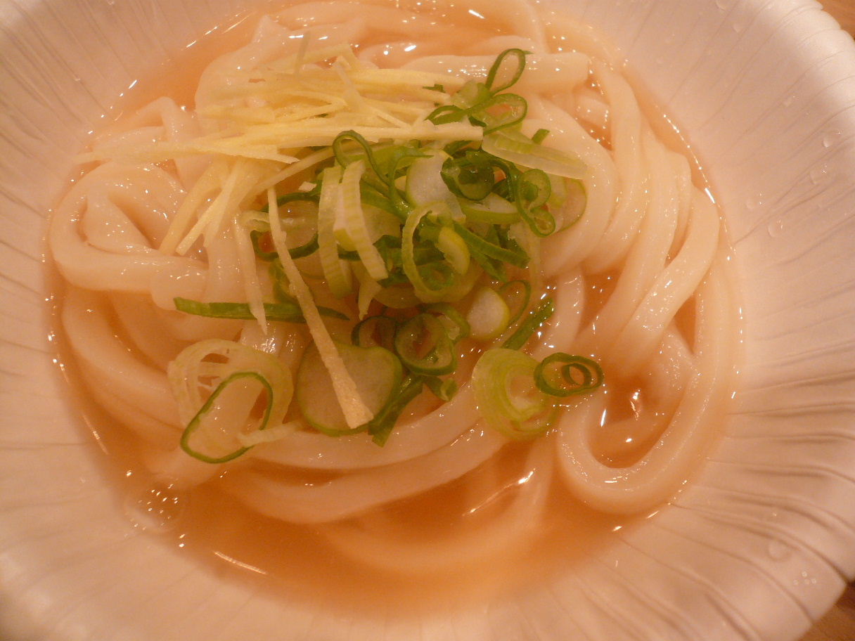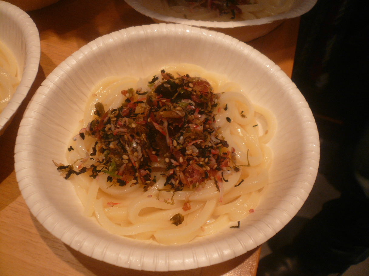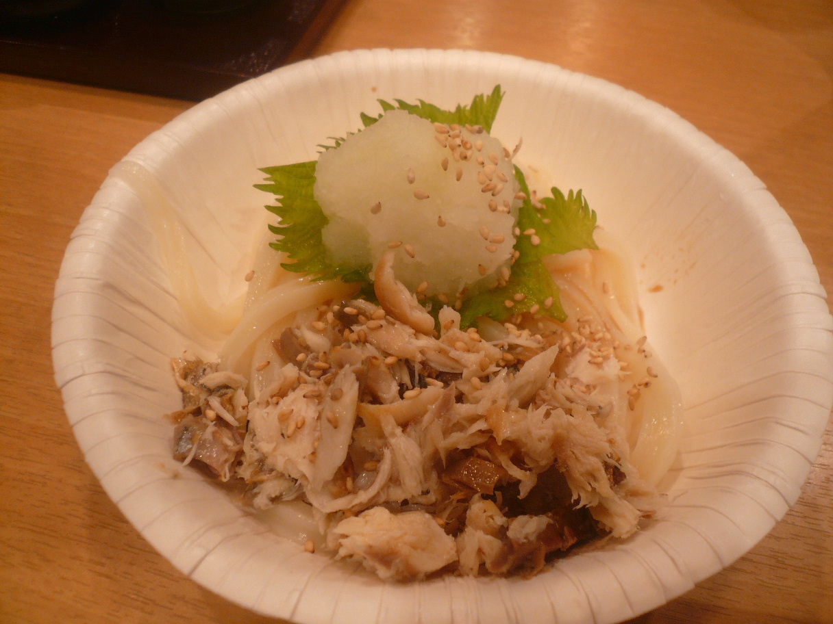福岡市中央区大名1-11-4 092-724-3855 今日はこちらのお店でイベントがあると言うことで。 ひょっこり参加してみました。 今回は「酒民党」さんというグループが主催。 何故「民酒党」で無いのか不明です(笑)。 今回は酒とうどんがテーマで、2種類のうどんが出てきて。 どちらが好評か投票をして。 上手くいったら店のメニューにと言うことらしいです。 さてどんなうどんが出てくるのかな? あっ、ちなみに僕はビールを一杯頼んでいます。 これに合わせるのもポイント。 って政見放送という名のユーストリーム放送をしていて時間が掛かるので。 その間に天麩羅を。 各100円で鶏天とごぼうかき揚げを。 これは間違いなくビールに合います(笑)。 少し塩分を効かせた鶏は胸肉かな? かき揚げはかりかりに揚がっていた。 美味いですね。 なんて思って待っていたら1品目。 焼き鯖ほぐしうどん。 焼き鯖を丁寧にほぐして大根おろしと大葉で仕上げたうどん。 味付けは下に引いている醤油のみ。 焼き鯖は塩分も効いていてうどんに合いますよね。 脂も少しあるので癖もありますがそれを大根おろしが旨くまとめます。 この塩っぱさがまたビールに合うと思います。 2品目は。 生姜餡かけうどん。 食べてビックリなくらいの生姜の量。 絞り汁と生姜を思い切って加えました、って感じ。 正直辛いと強く思えるくらい効いていて、挑戦的。 僕はこういった挑戦的な味わいが好きですね。 餡かけの温かさも加わってポカポカしてきそうですね。 僕は正直美味いのは餡かけ。 でも酒との組み合わせでは焼き鯖かな? って思いました。 投票でも同じ感じで焼き鯖になりました。 でもランチであったら生姜餡かけうどんが食べたいな。 ちなみに有名な梅ふりかけのお店のふりかけをかけたうどんもこっそり出ました。 これも面白いですね。 でもちょっと変化球過ぎるかな? 面白いイベントでした。 こういったものならまた参加したいなぁ。 ご馳走様でした。