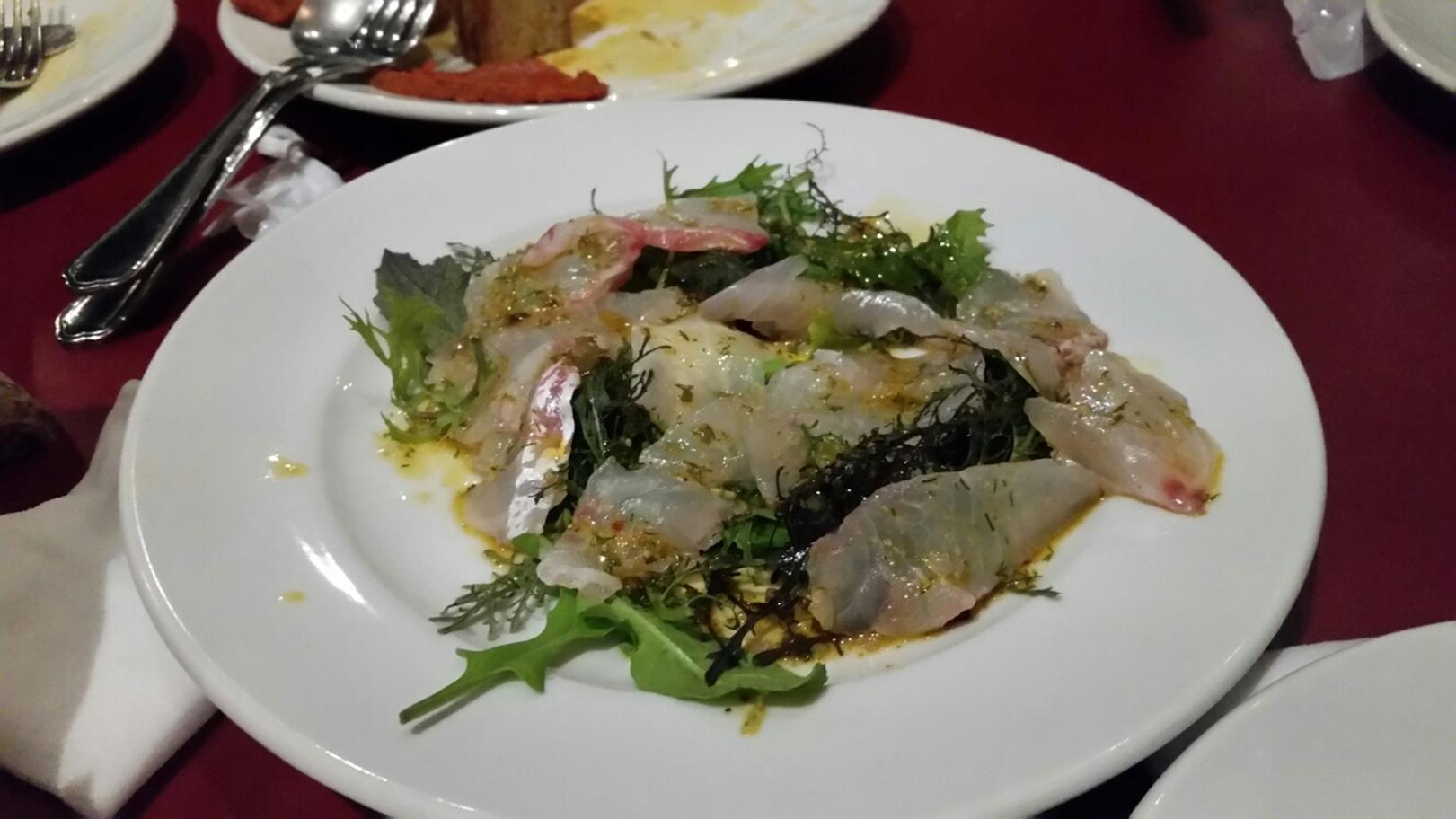 福岡市博多区中呉服町3-28 092-262-1136 今回も会社の歓迎会をこちらに。 呑み放題をつけて4,000円と言う予算の低さの中いろいろと出してもらいました。 人数は多いもののこの予算でいろいろ出してもらって申し訳ないです。 まずはこちらからいただきました。 カレイの造り。 立派なお造りの奥には実はゴマサバと鯵、ヤズが。 別皿にはチダイの造りも出ていた。 ありがたいとお店の人にも行ったのですが、大将は。 「季節の終わりのチダイは安いし、カレイは旬。 福岡県外の人も多いと言ってたから予算内で考えたらこれだったよ」 とのこと。 ありがたい話です。 この後、唐揚げとこちらのお店の人気のギョロッケ(魚のすり身のコロッケカレー風味)をいただいた後。 鍋に。 話をしていて気づかない間にほとんどなかったので食べれなかった(涙)。 仕方ないけど魚が多いありがたい鍋でした。 最後に造りの残りで作ったあら汁が出て〆。 ここは本当に良いな。 またプライベートでも行かなくては。 ご馳走様でした! |