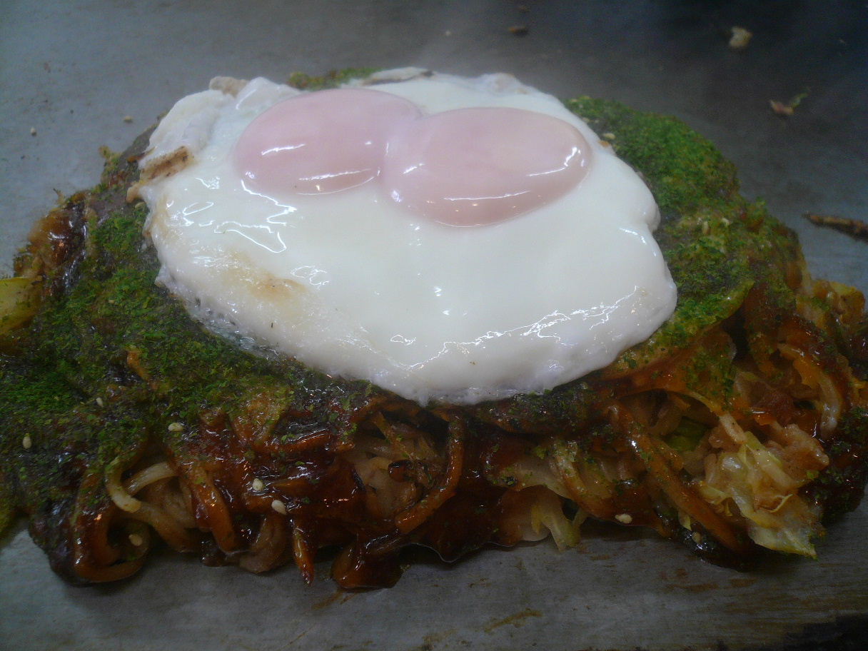 福岡市南区皿山3-11-32 092-512-3815 今日はなんと福岡でも見つけた「三八」さんのお店。 以前広島でも食べたことがあってジャンクなお好み焼きで懐かしく食べていたなぁ。 なんて思いだして行ってみました。 こちらはあのお店みたいに行列は出来てませんがお客さんは多かった。 お店の人は「三八」さんで修行をされていたそうで、生まれは福岡ですが、育ちが広島だったらしいです。 なんだか親近感も沸きました(笑)。 さてこちらを食べてみました。 肉玉ソバ650円+目玉焼き100円。 肉玉ソバ650円+ネギ100円。 焼き方はよく似ているね。 焼きそばは既にイカ天等で味付けをしてあって、それを頼まれる度に焼き直している。 生地の上にたっぷりの魚粉をかけている。 その上にソバを乗せて上に細く切ったキャベツをたっぷりと。 そして豚肉を5枚くらい乗せていた。 その後、生地を上から垂らしてひっくり返して。 かなりぎゅうぎゅう押さえた後、何度も持ち上げて空気を入れていた。 不思議だ。 そして二双卵(双子の卵)を潰して貼り付けてソースをかける。 ソースは同じならミツワかな? 違う所はかなり焦げたキャベツを捨てるところ、もやしが少なめな所、ニンニクの香りが余りないところ。 最大の所はキャベツがそこまで多く残らないところかな? でもジャンクで三八さんの要素はたっぷり。 なんだか懐かしく食べれた。 お好み焼きは美味しさだけでなくノスタルジックな部分も多いんだろうなぁ。 美味しかったです。 もし出来たらキャベツWとか無いのかな? 食べてみたいな。 ご馳走様でした。