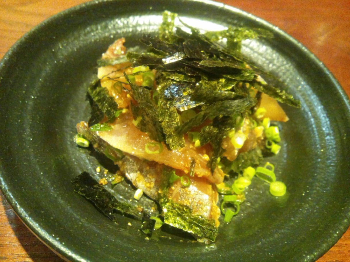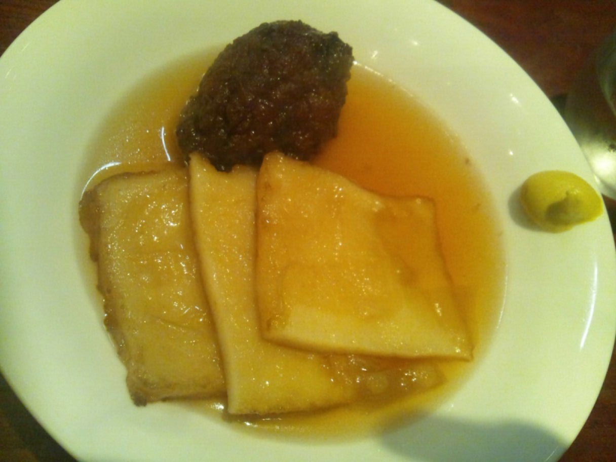 福岡市中央区春吉3-15-12 092-762-6222 今日は久々にこちらのお店へ。 2度目の訪問です。 ちょっと食べた後の2軒目でしたが楽しめました。 って酔っているので明確には覚えていないのですけどね(苦笑)。 さてお店はだいぶ慣れてきた感じがありますね。 落ち着きの中に明るさもあって良い感じ。 さてまずはこちらを。 おでん2種300円。 1種150円です。 僕は練り物に目がないので練り物でお薦めを頼んだらこちらを。 角天と豚骨のなんこつが入ったヤツを。 角天はぷりぷりしていて魚の旨味が感じられる美味しいもの。 大きくごろっとしているのは軟骨のプツッとした食感が面白い。 2種類がまた違う食感ってのが良いね。 出汁が少し濃いめになっていたのは酒呑みようだろうか? もう少し軽くても嬉しいのだけどね。 鯵のたたき。 たたきと言っても結構大振りに切っていた。 海苔の香りがしっかりしていて鯵に負けていないのが面白い。 ゴマの風味がしっかりしているし、これまた酒呑みが楽しめそうな濃い味付け。 鯵の香りも好きだしこれはなかなか良いね。 これで500円ってのもありがたい。 美味しかったです。 軽く呑んだけどまたしっかり食べてみたいな。 次は1軒目で。 ご馳走様でした! |
