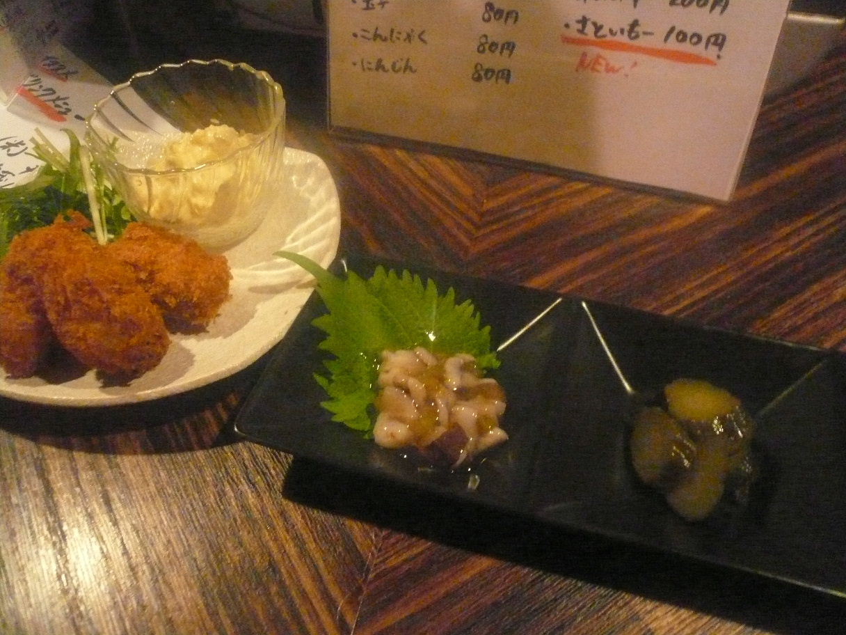 福岡市早良区高取1-28-6 092-833-8010 今日はこちらで軽く呑みました。 この日は送別会があって意外と飯は食べている。 だから少し呑み食いできたらなぁ。 なんて思っていると「角打」との看板が。 これなら軽く食べれるかな? なんて思ってきました。 入ると「角打」と書いているけど立ち呑みではなく、椅子がある。 のんびりと居れるお店ですね。 あとカウンターに自分でお酒を造ったりすると呑み放題600円とか書いてあった。 面白いやり方ですね。 ちょびっとカキフライ300円+つまみ3酒350円。 カキフライはちゃんと牡蠣の旨さがあるいいカキフライだ。 牡蠣のスープもたっぷり入っているし、香りもある。 冷凍ではない牡蠣を食べれるとは思わなかったので嬉しかった。 つまみ3種は・・・、写真が2品しか写ってない(苦笑)。 たこわさ・ピクルス・イカの塩辛でした。 どれもシンプルに酒を呑める料理でした。 ピクルスは酸味が柔らかく食べやすかったなぁ。 酢もつ。 ほんとに酢で味付けをしたモツだった。 酢が効いていてすっきりしたモツは冷やして出しているけど、脂っぽさもない。 モツを酢で味付けするのは初めてだけど、シャキシャキ感と酸味の組み合わせは良いね。 色んなところで出してくれたら嬉しいのに。 なんて思える料理でした。 面白いお店ですね。 日本酒も見たことが無いお酒が多かったし、お酒好きにも楽しめるのではないでしょうか? お酒は升に溢れるくらいついてくれて650円~700円くらい。 普通なら安く、角打ならちょっと高めかな? このバランスが面白いですね。!