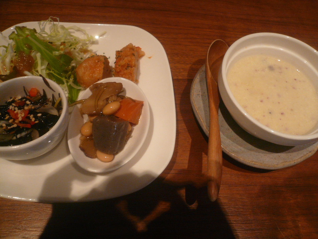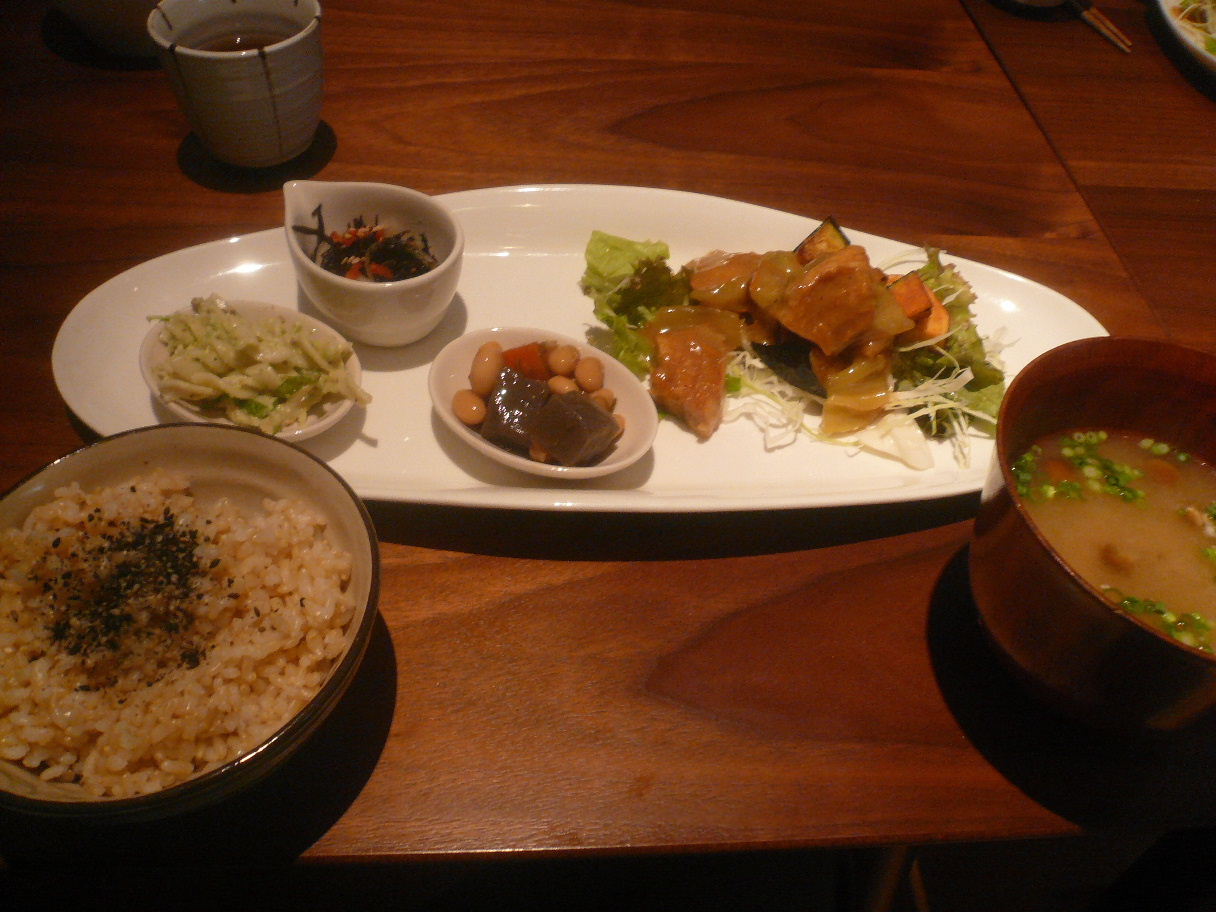 福岡市中央区大名1-10-16 YUMIC大名 3F 092-714-2333 今日は、連チャンでマクロビオテックランチ。 身体がこういった料理を欲していたのかも。 こちらのお店は、鰻の寝床のように細長い作りになっている。 料理をされている方とサポートの女性が1人。 サポートの女性があまり話しても返事が返ってこないのが不安をそそる。 でも店自身は綺麗だし、いい感じだなぁ。 ランチは色々種類があるけど僕はこちらをチョイス。 前菜は蒸し野菜。 これを味噌や漬け物のような物で食べる。 野菜はやっぱり広島でいいものを食べてきたからだろうか。 美味しい野菜だったけど、わりと特別感の味わいはなかった。 でも渋い味噌や、塩分の強い漬け物で食べると甘さが際だつ。 シンプルだけどこういった料理もいいね! 麻婆里芋セット1,000円。 豆腐の変わりに里芋で作った麻婆豆腐かな? 食べると辛みは軽いけど山椒がスッキリきいていて美味い。 油も少しあるけど、軽い油で食べやすい。 美味しいですね。 香りも加わっているし、マクロビ料理とは思えないね。 相方は里芋と青菜の炒め物が前菜。 これもスッキリしていて食べやすい。 ちょっと生姜がきいていてここがポイントですね。 メインはひまわり種を使ったマクロビハンバーグ1,300円。 雑穀をたっぷり使っていてぽろぽろした食感が特徴かな。 あっさりしていて、よくある豆腐ハンバーグとは違う食感が面白いね。 大根おろしが辛みもあって汁がちゃんと残っているのが嬉しいね。 美味しかったです。 また行ってみたいな。 出来るなら味噌汁が欲しいけどね。 ご馳走様でした。